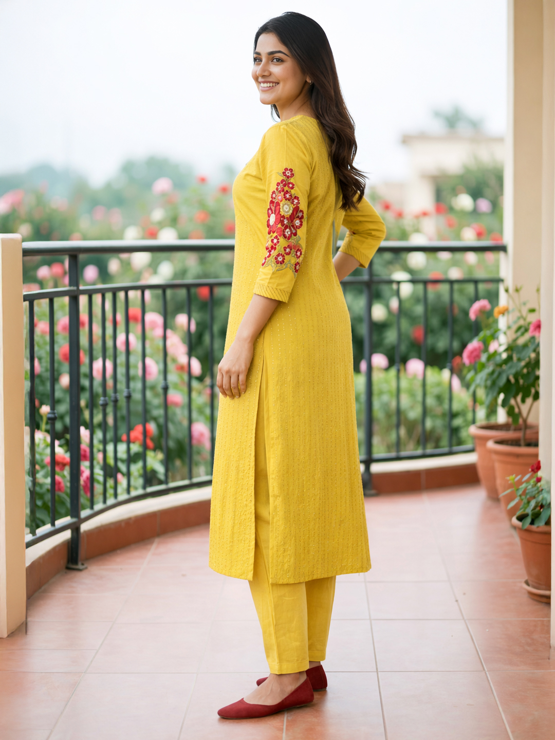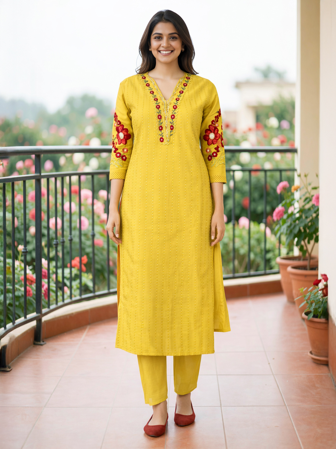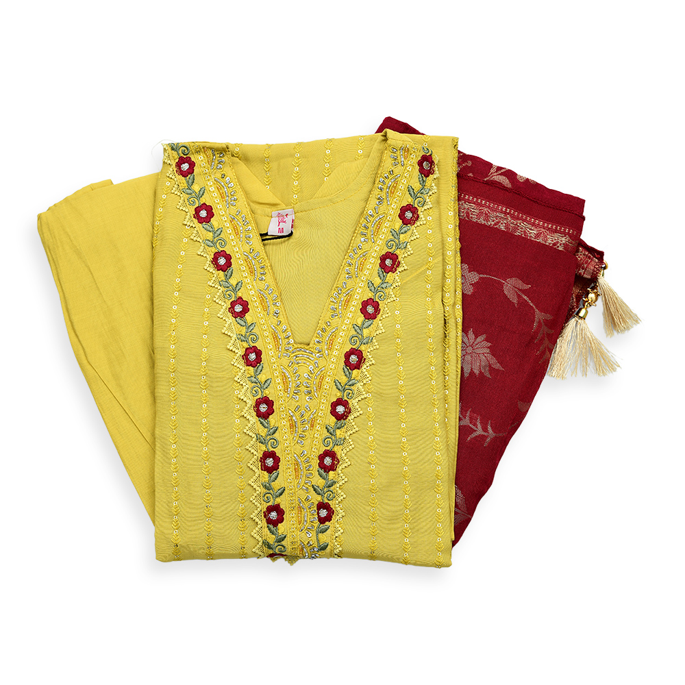 Brighten up any occasion with this stunning yellow kurta paired with a rich red dupatta. The vibrant color combination creates a festive-ready look that’s perfect for celebrations and traditional gatherings.
