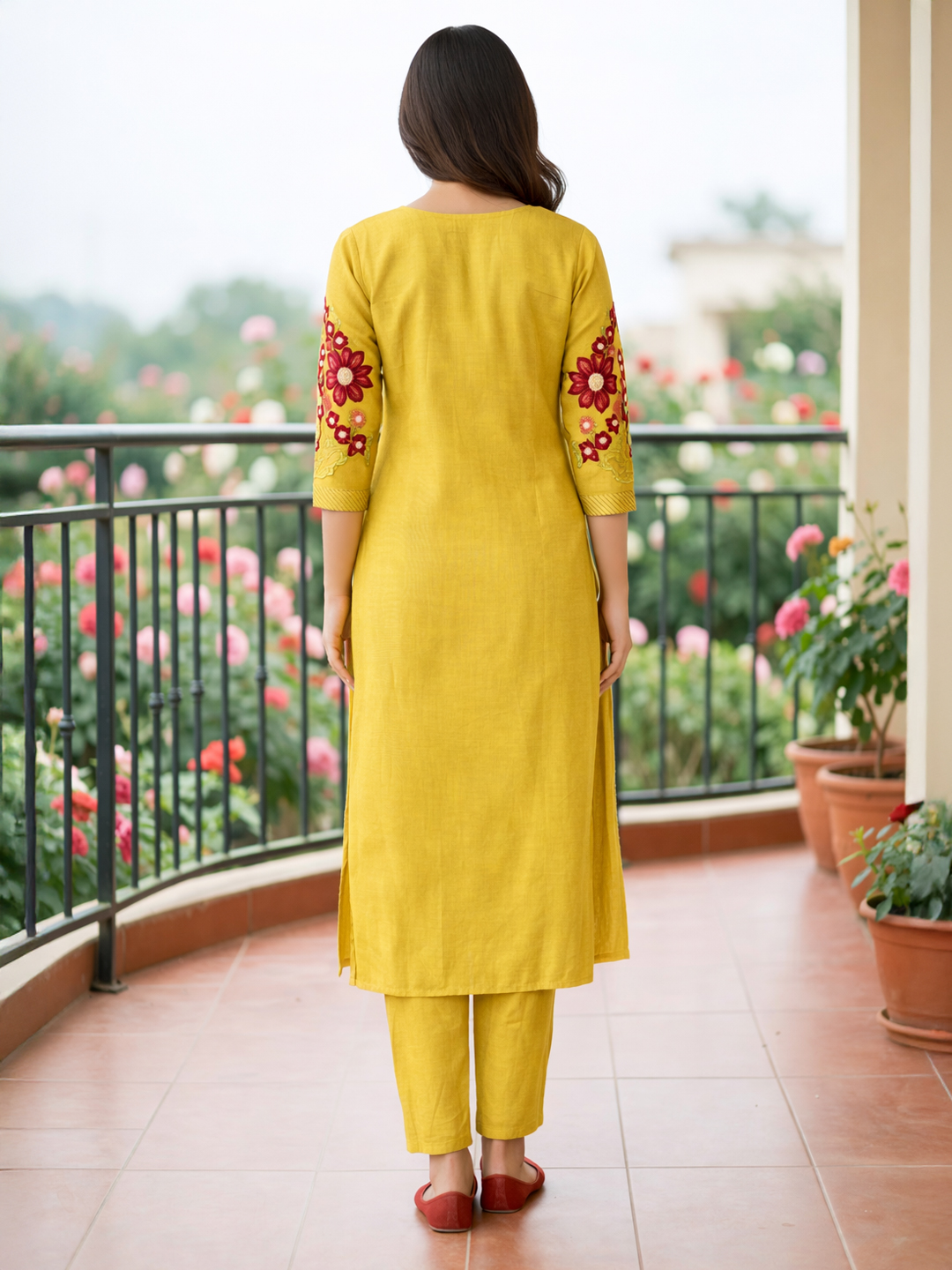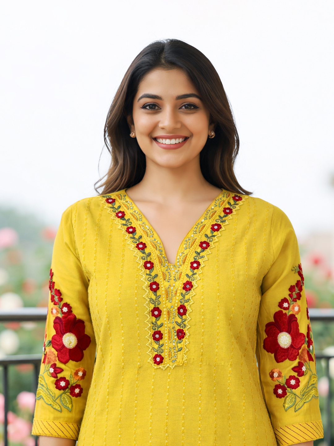 Delicate floral embroidery on the V-neckline and sleeves adds a touch of sophistication and charm. The fine detailing enhances the overall appeal, making it a standout ethnic ensemble.