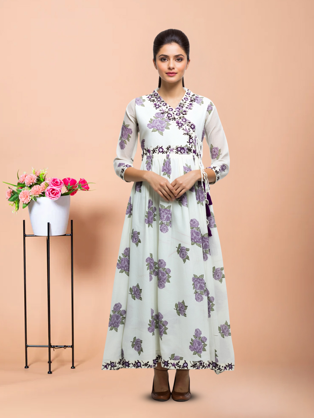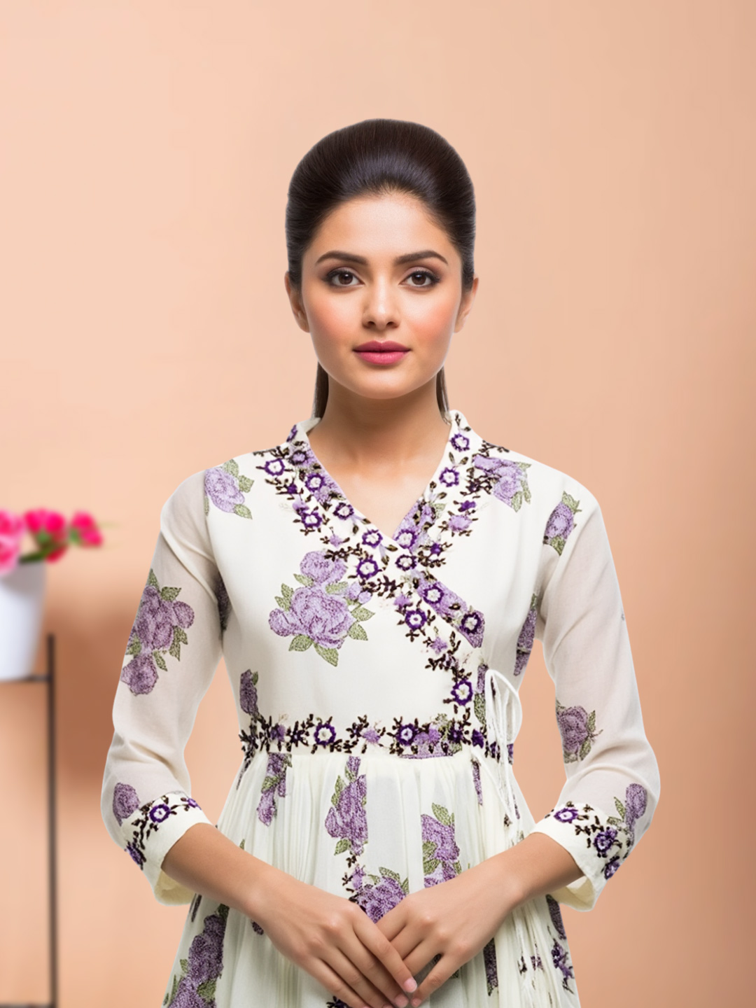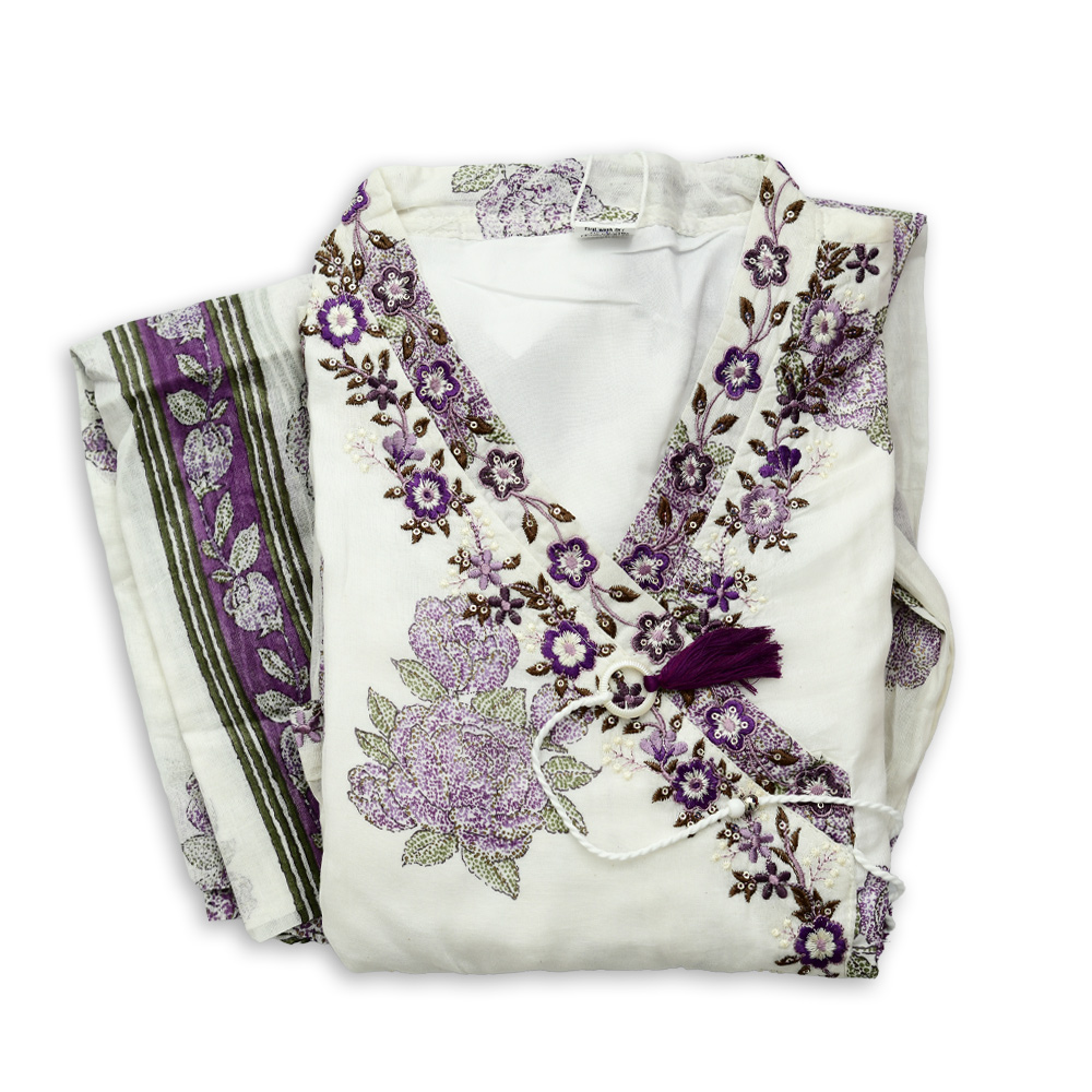 Step into effortless elegance with this floral embroidery wrap-style kurti set. The all-over floral print adds a refreshing touch, while the contrast-bordered V-neck enhances its sophisticated appeal. Designed to flatter every silhouette, this outfit is perfect for graceful everyday wear.