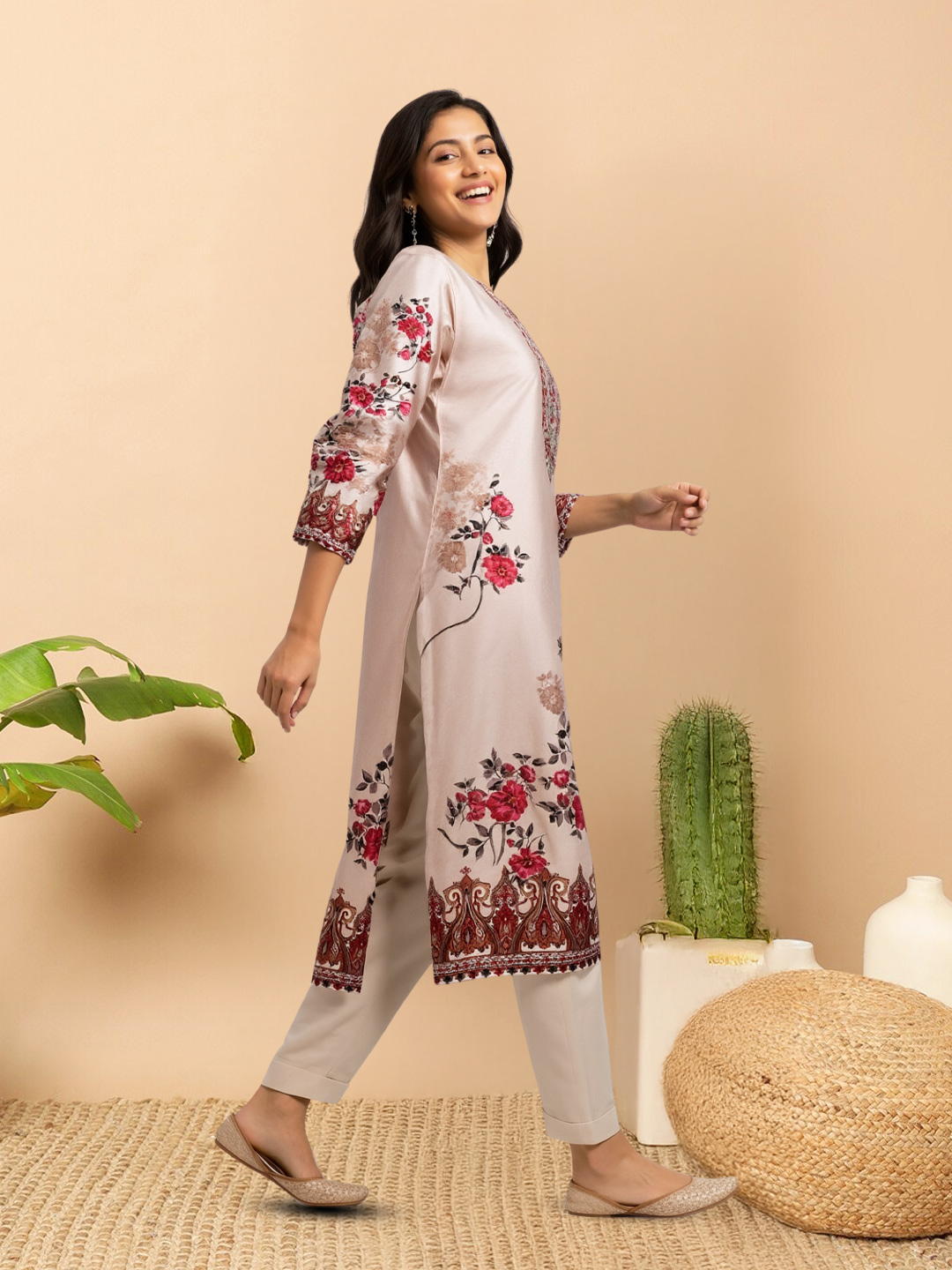 A modern take on a traditional favorite. Featuring a slim-fit kurta with intricate floral embroidery, this set includes a straight-cut pant and a beautifully embroidered dupatta. Perfect for women who love classic Indian wear with a touch of minimal sophistication.