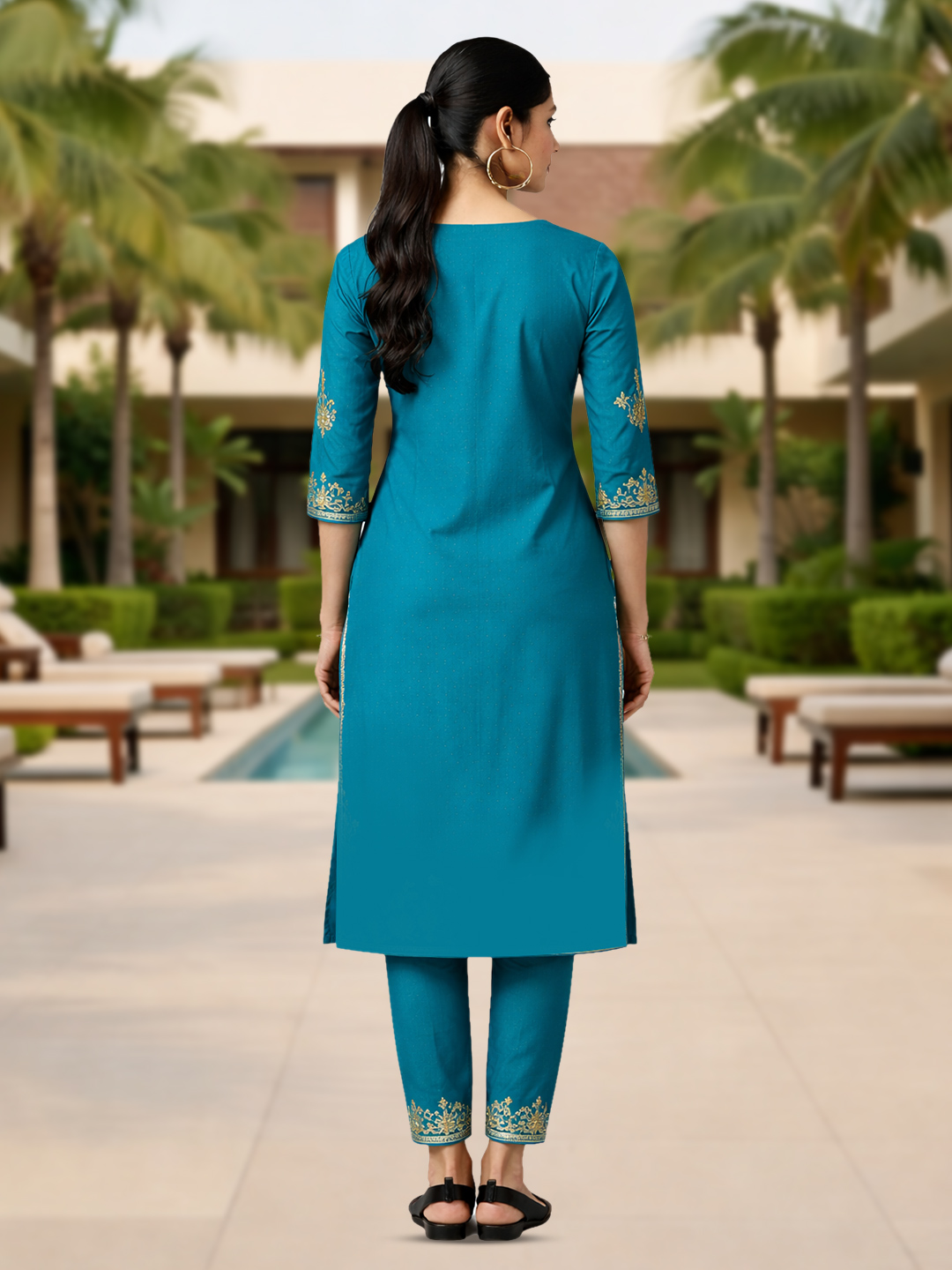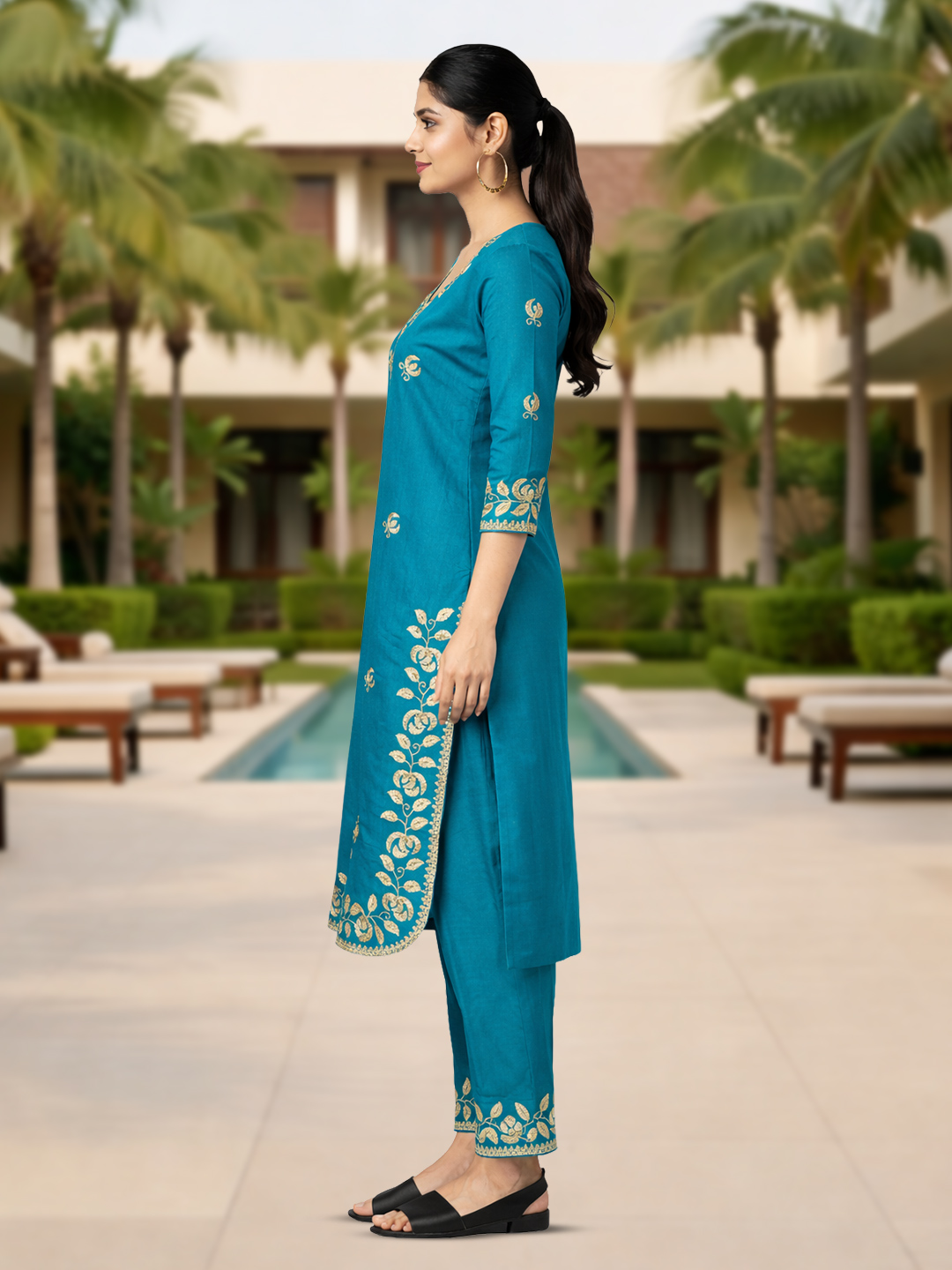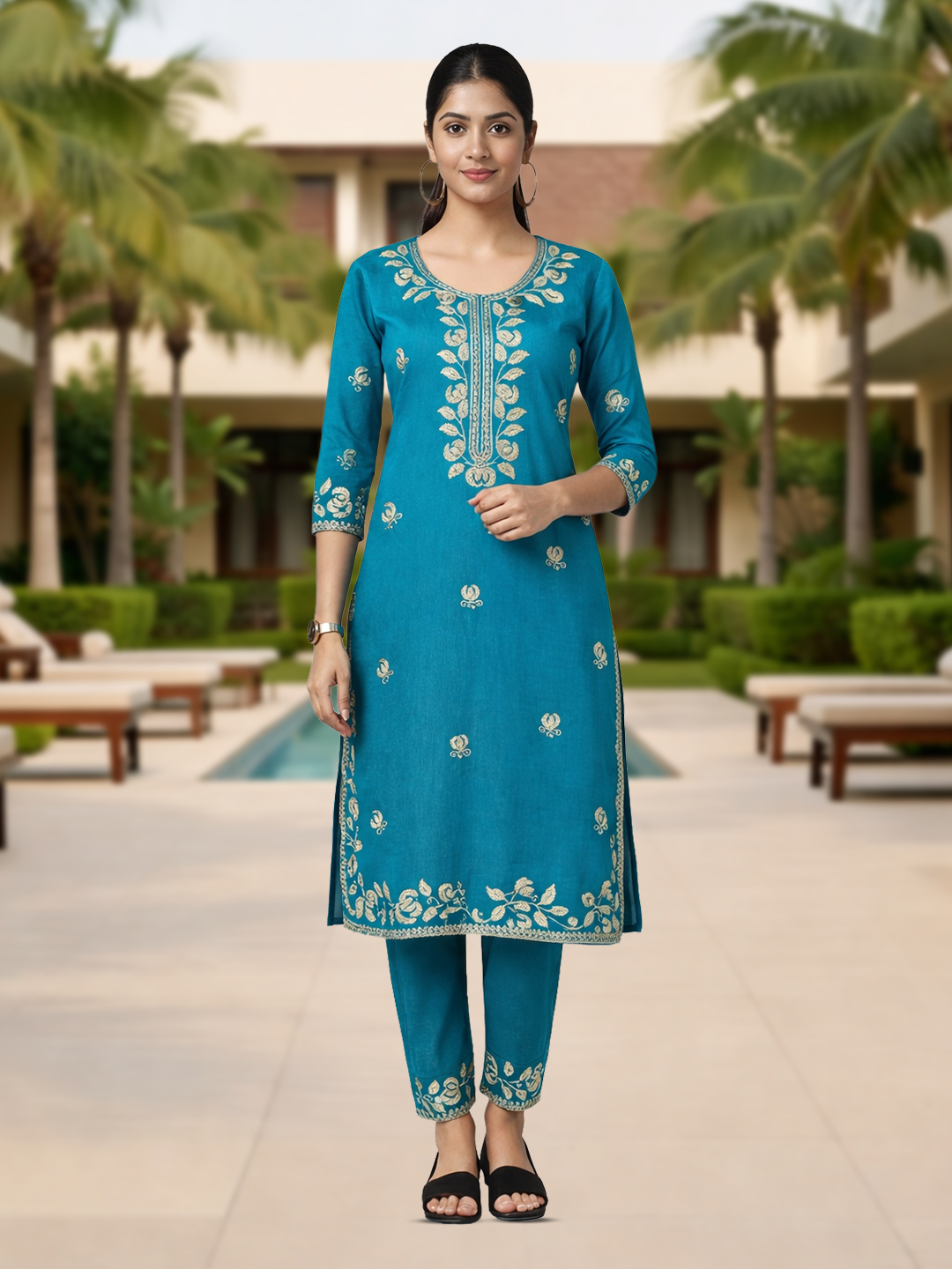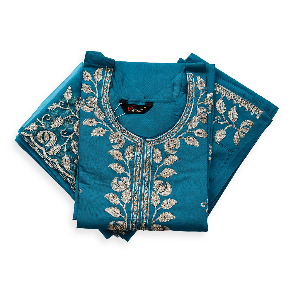 Step into effortless elegance with this teal straight-cut salwar suit set, adorned with delicate floral embroidery. The soothing color paired with intricate detailing on the neckline, sleeves, and hem creates a refined ethnic look. Designed with breathable fabric and a graceful silhouette, it ensures all-day comfort while keeping your style on point.