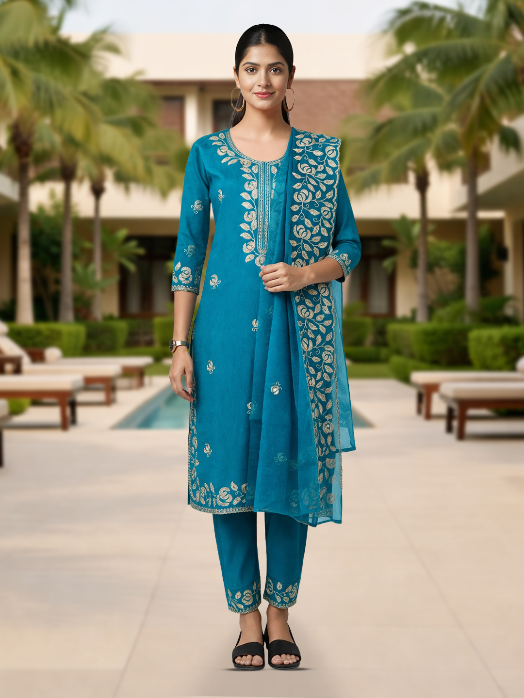 Enhance your ethnic wardrobe with this stylish straight-cut suit set that flatters every body type. The elegant teal hue, combined with intricate floral embroidery and a well-tailored design, makes it a versatile outfit for multiple occasions. Complete with a coordinated dupatta, it’s all about effortless charm.