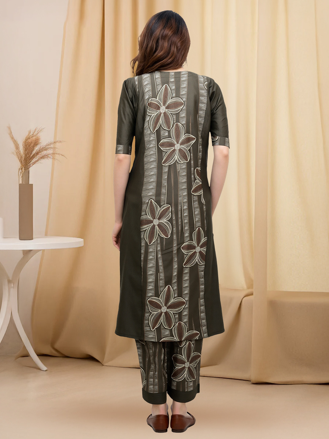 Bring timeless charm to your wardrobe with this beautifully designed kurta set. The graceful floral motifs paired with vertical stripes create a refined look that feels both classic and modern, perfect for everyday elegance.