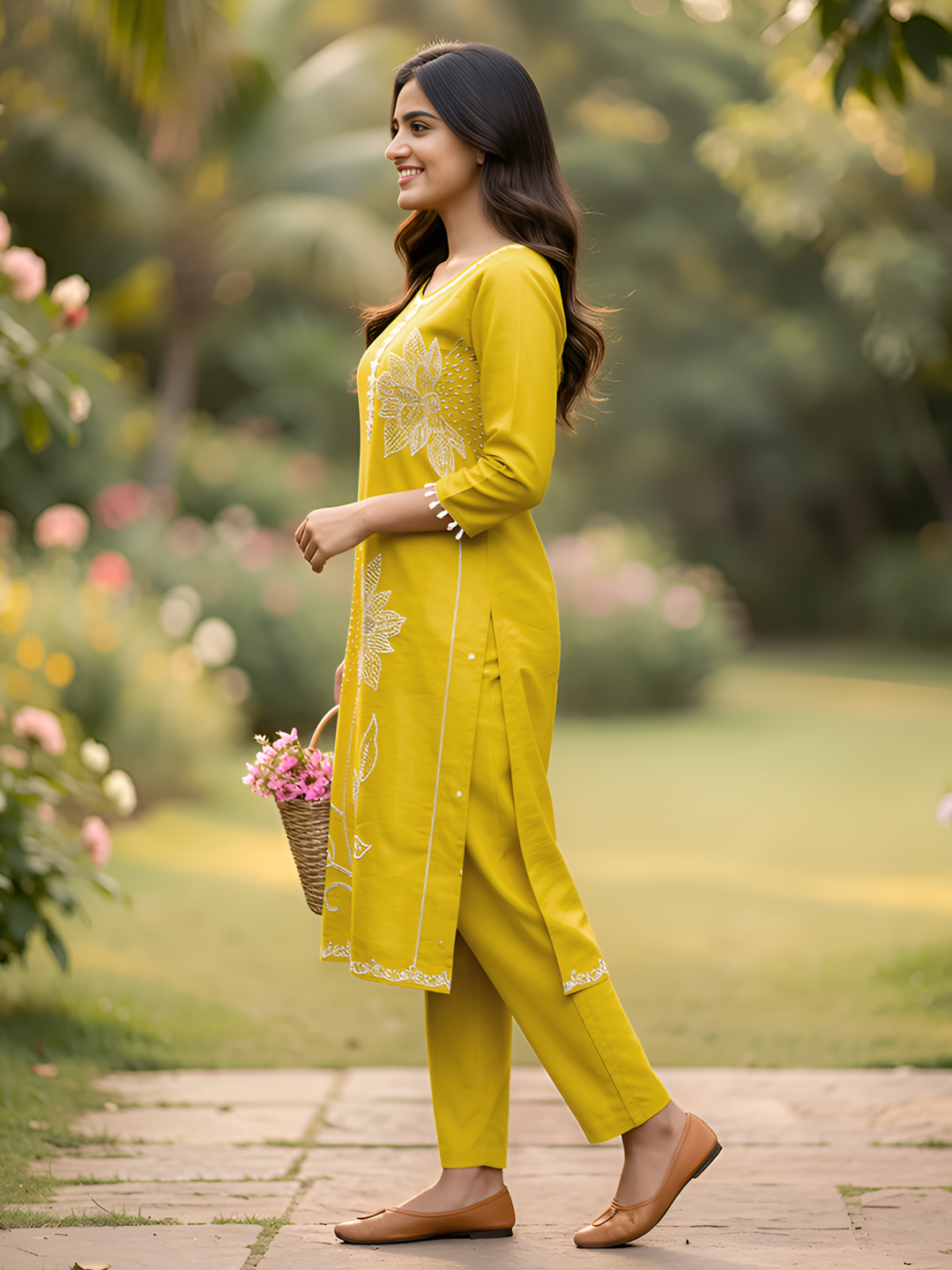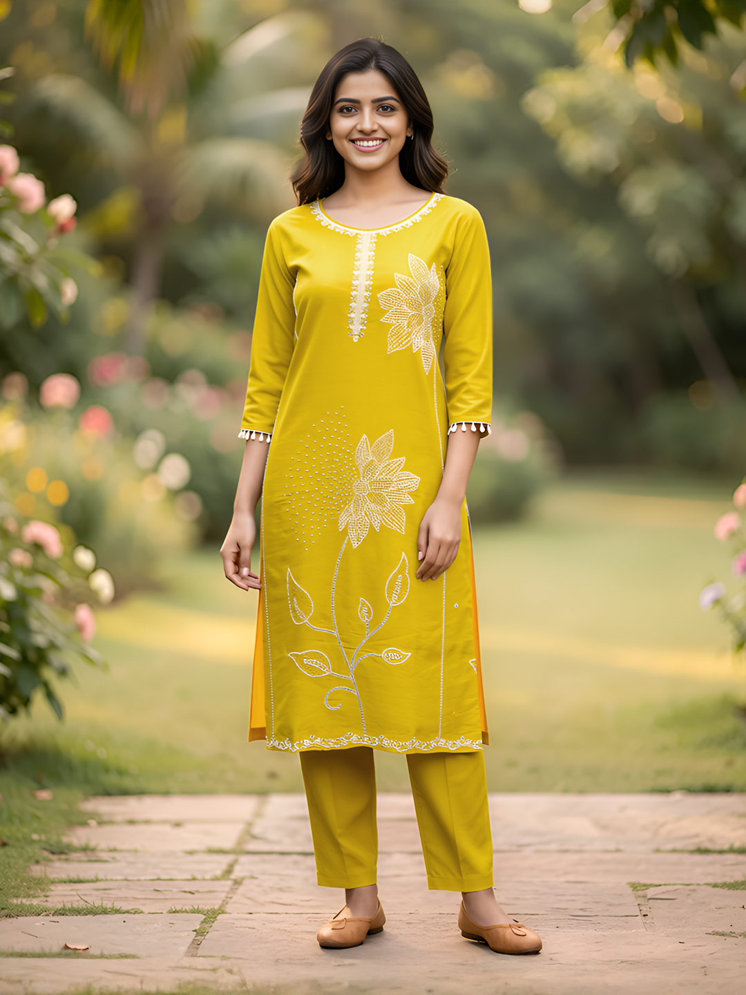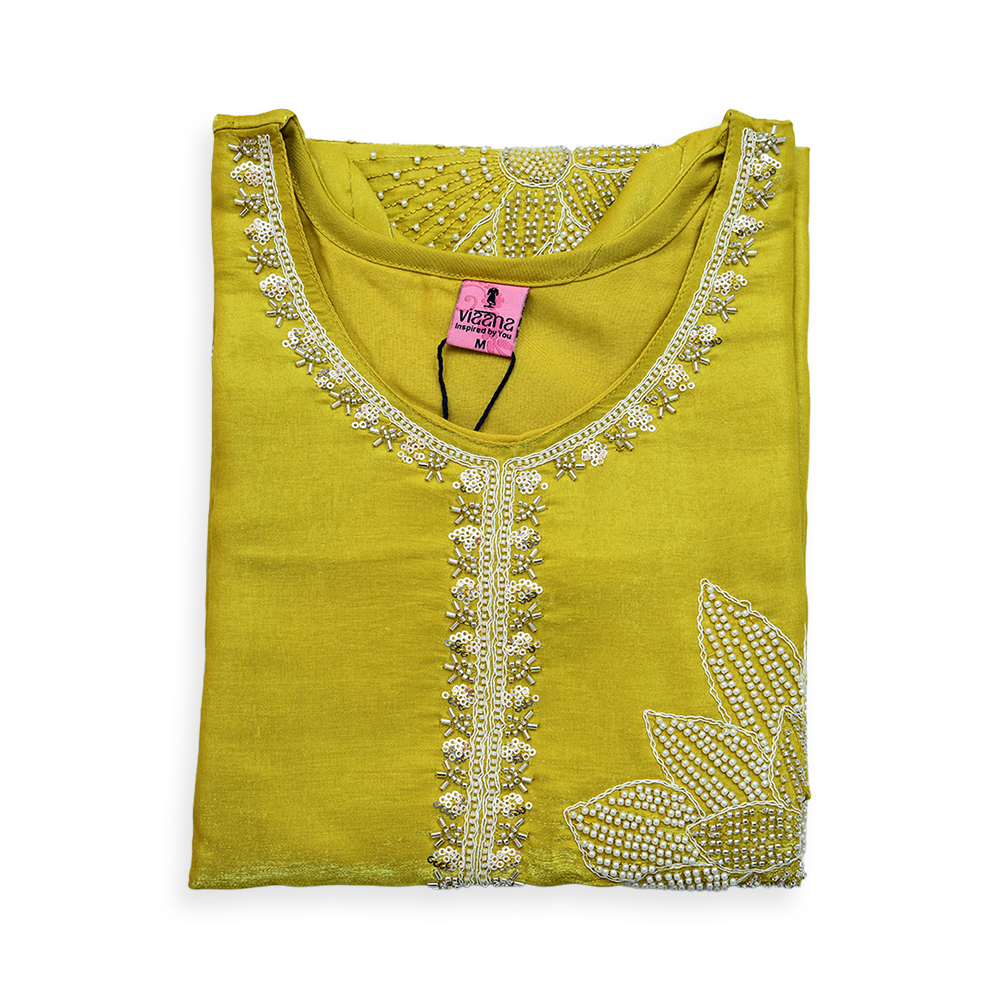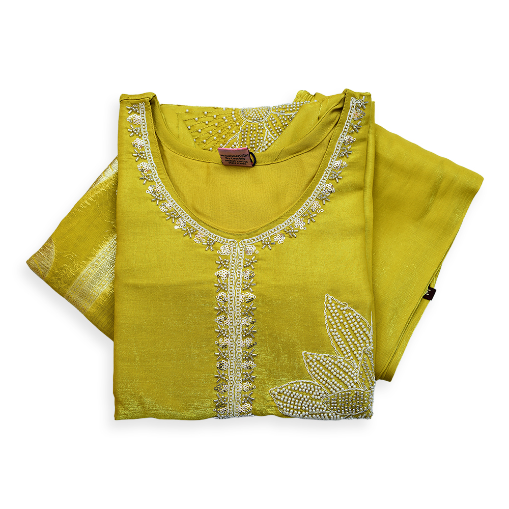 Step into elegance with this beautifully designed salwar suit set featuring delicate floral pearl bead embroidery. The straight-cut kurta enhances your silhouette while the intricate handwork around the neckline adds a graceful charm. Perfect for festive gatherings, casual occasions, and ethnic celebrations.