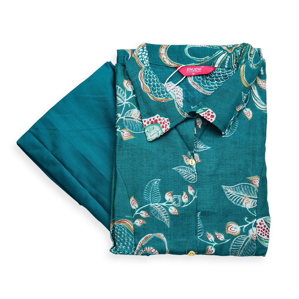 Refresh your ethnic wardrobe with this Floral Print Collar Neck Kurta with Palazzo Set, designed to bring elegance and comfort together. The vibrant botanical print creates a graceful look, while the classic shirt collar adds a stylish modern twist. Paired with matching straight palazzo pants, this outfit is perfect for casual outings, office wear, or small gatherings.