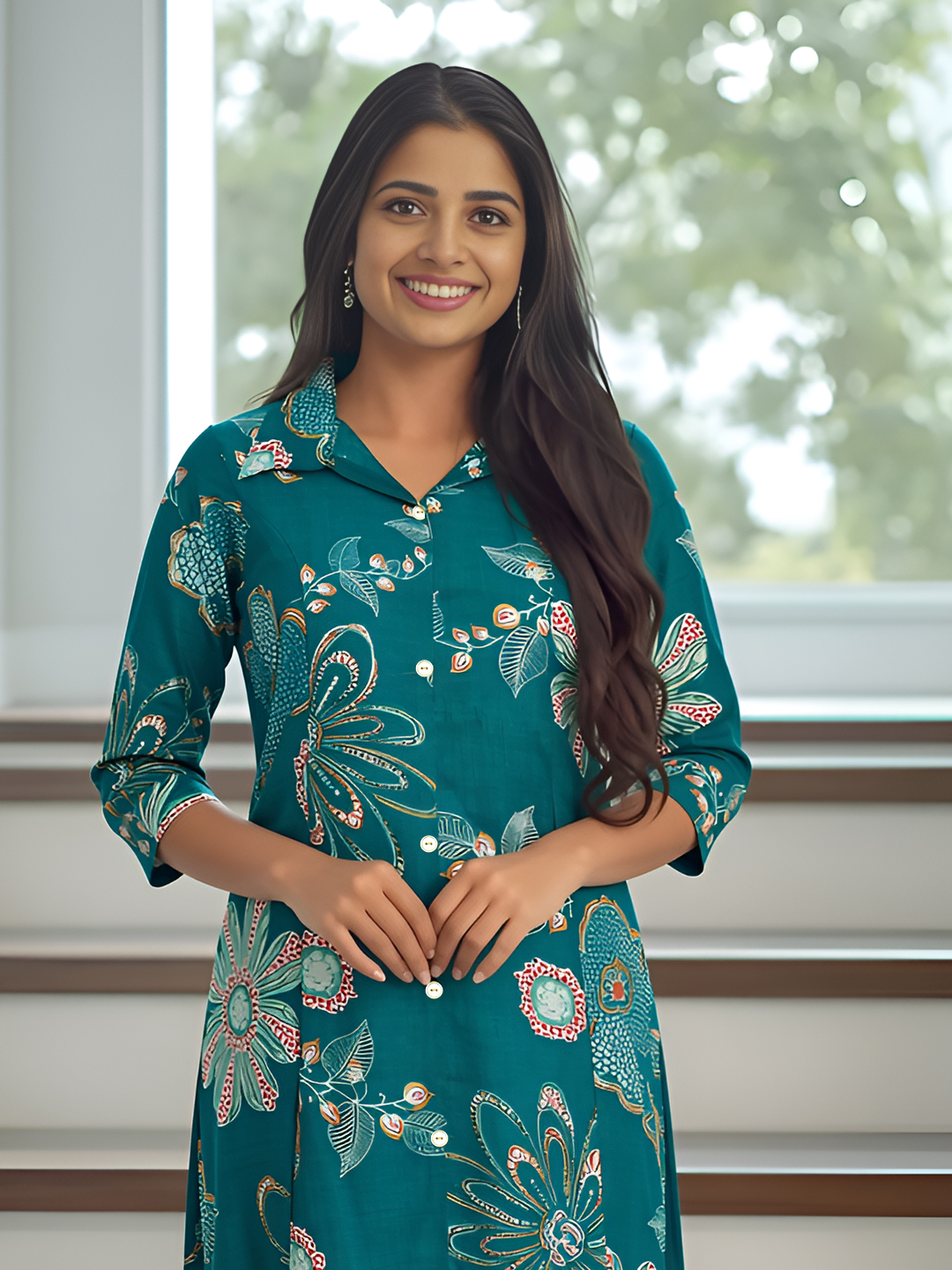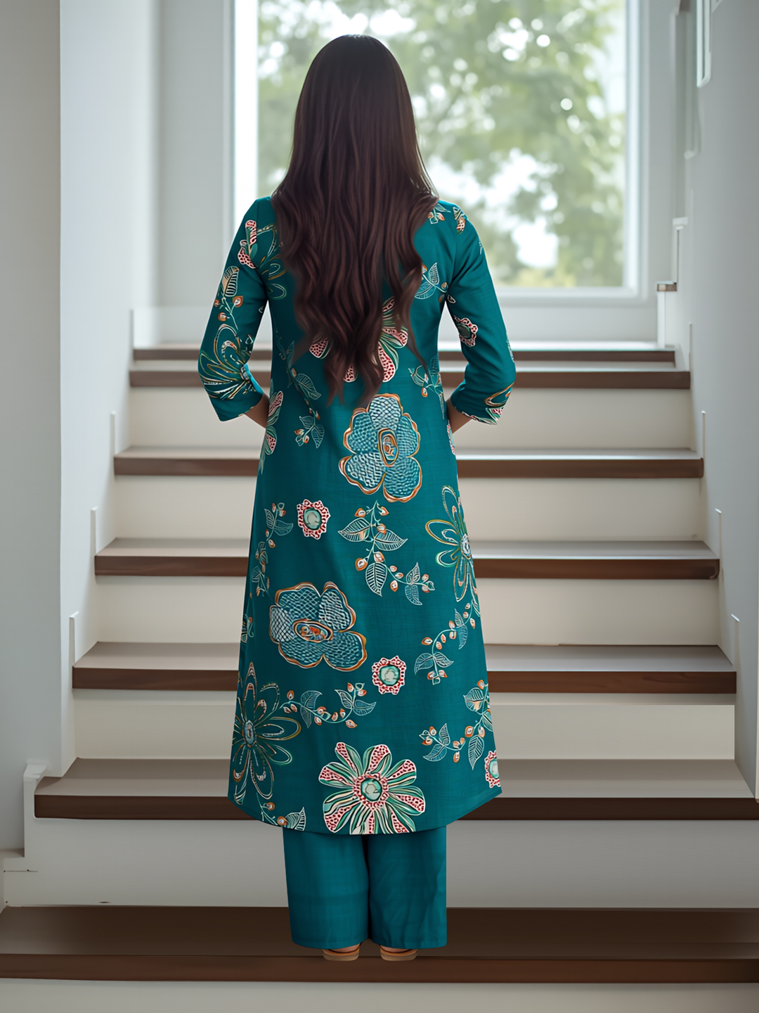 Upgrade your daily style with this stylish floral kurta set. The classic collar neck adds a modern edge, while the beautiful floral patterns bring a refreshing charm. Whether you're heading to work, meeting friends, or attending a casual event, this coordinated kurta and palazzo set keeps you looking graceful all day.