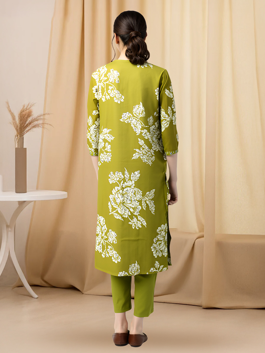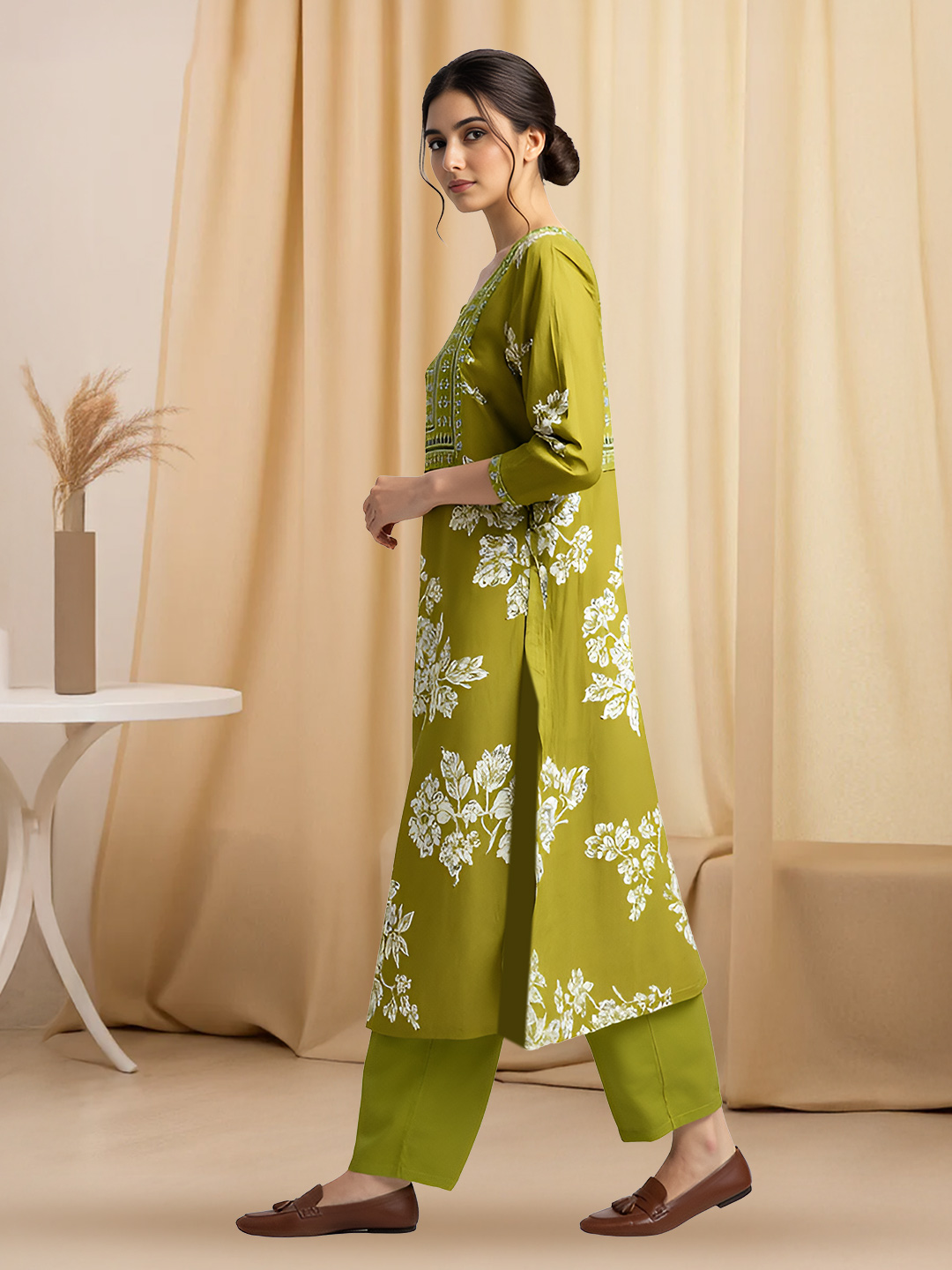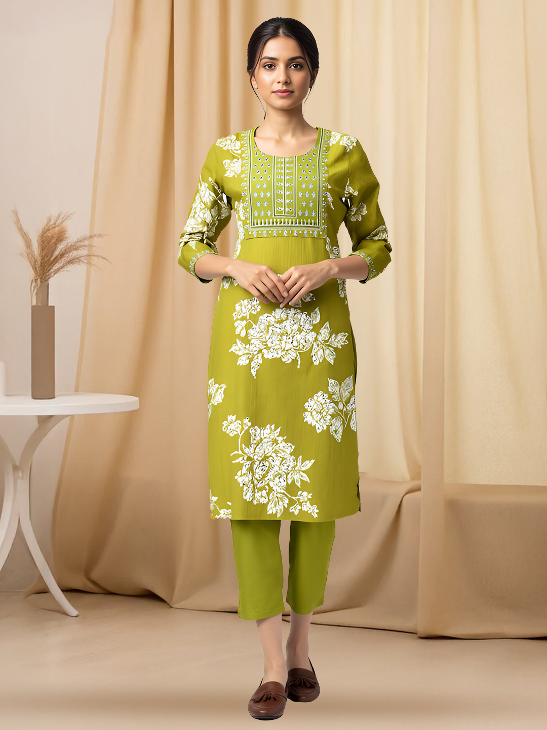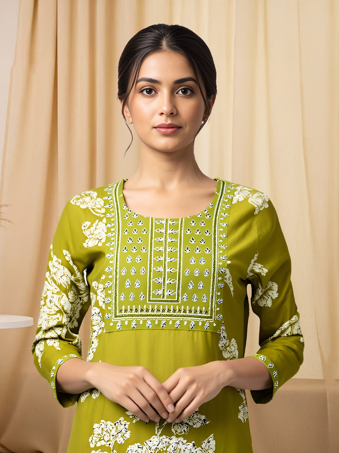 This salwar suit set beautifully blends traditional craftsmanship with modern design. The floral-printed kurta features a finely embroidered neckline that adds depth and grace. Straight-fit pants offer a clean, contemporary finish, while the soft dupatta with elegant woven borders completes the look with refined sophistication.