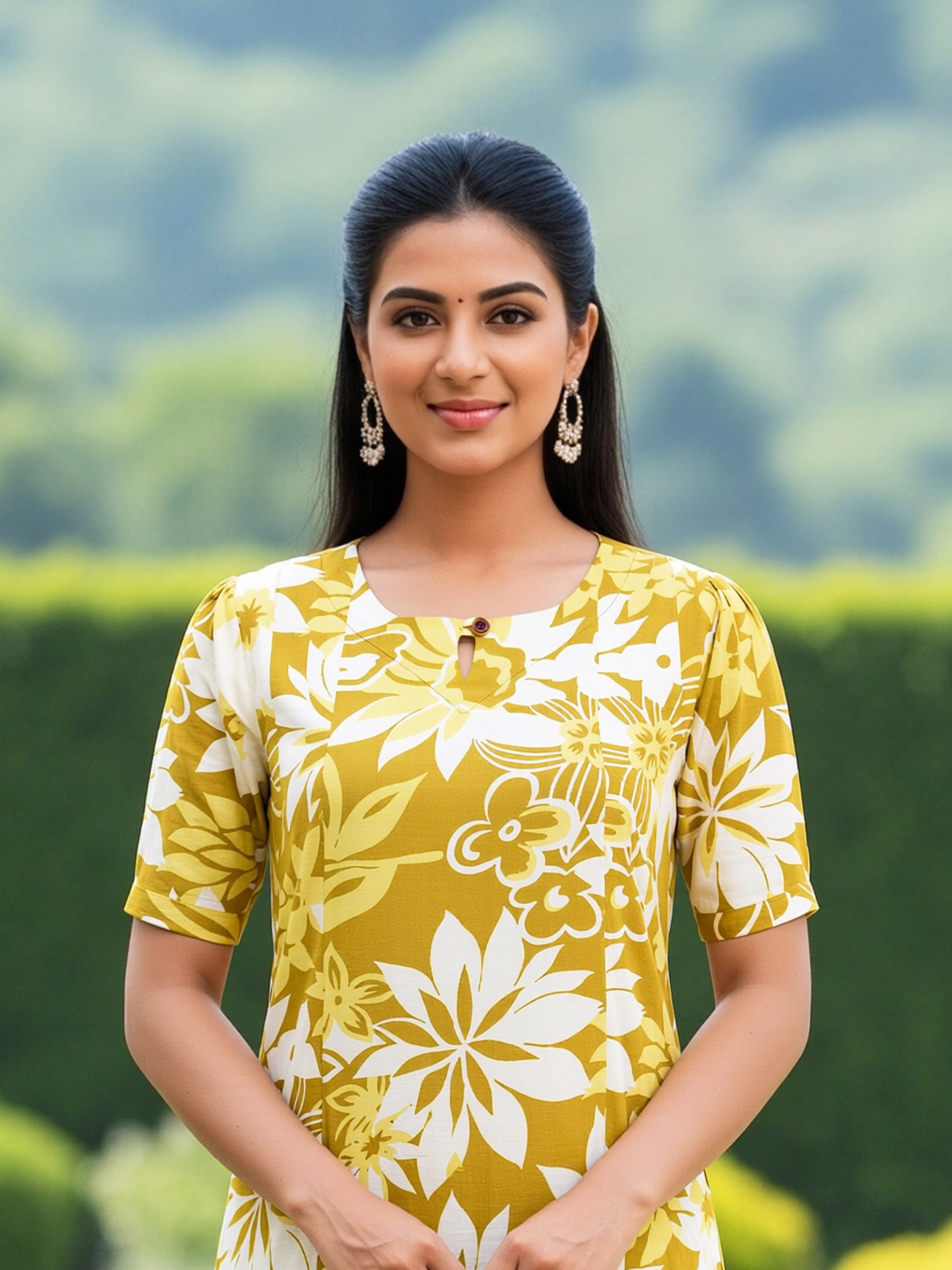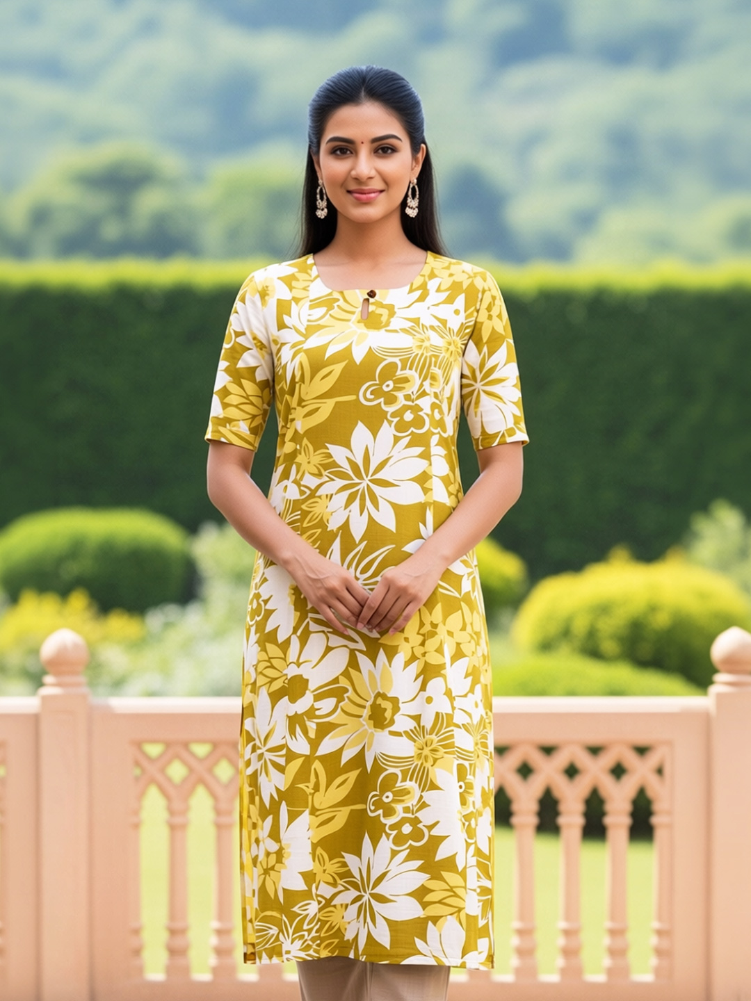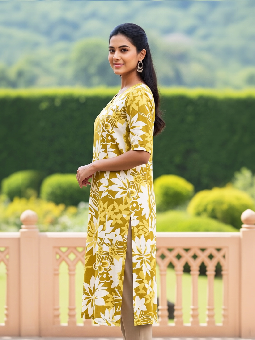 Bring sunshine to your wardrobe with this stunning mustard yellow floral kurta. The striking white floral design creates a refreshing contrast that feels both trendy and timeless. Its straight-cut silhouette provides a flattering and easy fit, making it suitable for all-day wear. The round neckline with delicate buttons adds subtle sophistication, while the half sleeves ensure comfort and practicality. The mid-calf length makes it a perfect choice for daily wear, office settings, or casual celebrations.