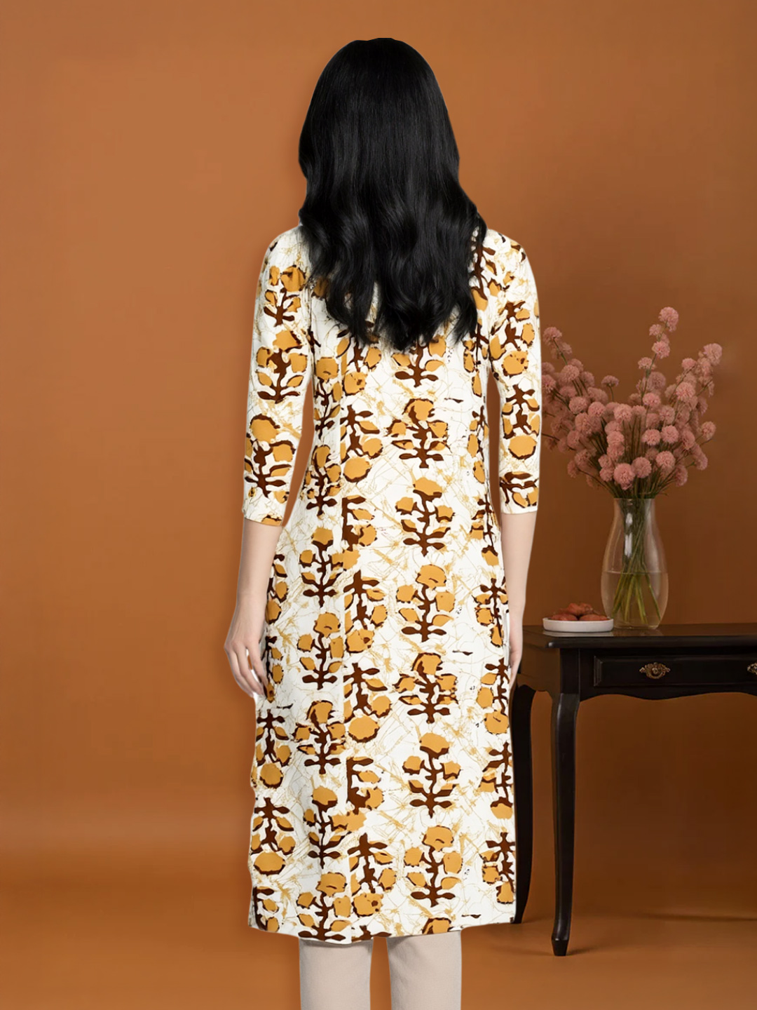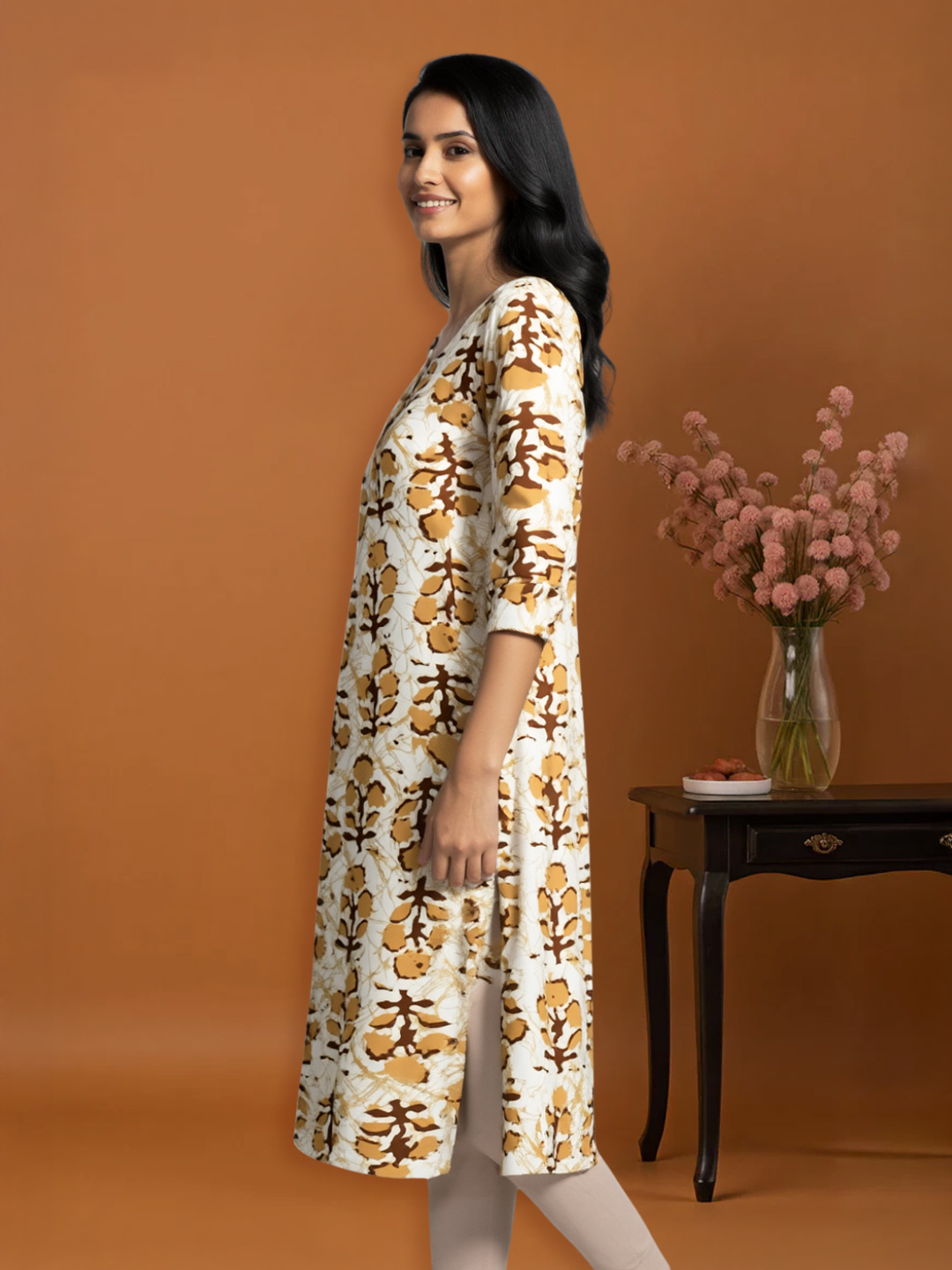 Embrace effortless style with this Floral Print Straight-Cut Kurta. Featuring a delicate floral pattern that adds a touch of nature's charm, this kurta is designed with a flattering straight cut for a sleek silhouette. The 3/4 sleeves and round neck offer the perfect balance of comfort and elegance, making it ideal for casual outings, lunch dates, or evening get-togethers.