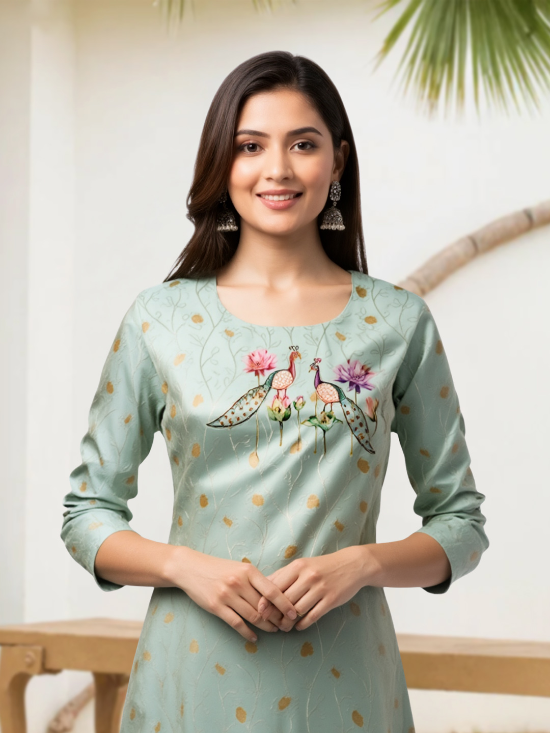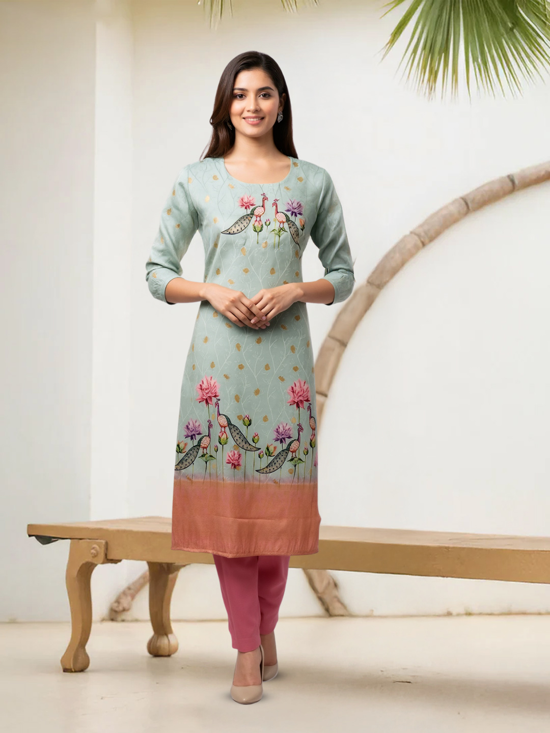 This salwar suit set showcases the perfect mix of craftsmanship and comfort. The premium fabric provides a luxurious feel, while the floral print and artistic bird embroidery create a standout design. Paired with a soft, lightweight dupatta and sleek straight pants, this ensemble is ideal for any ethnic occasion.