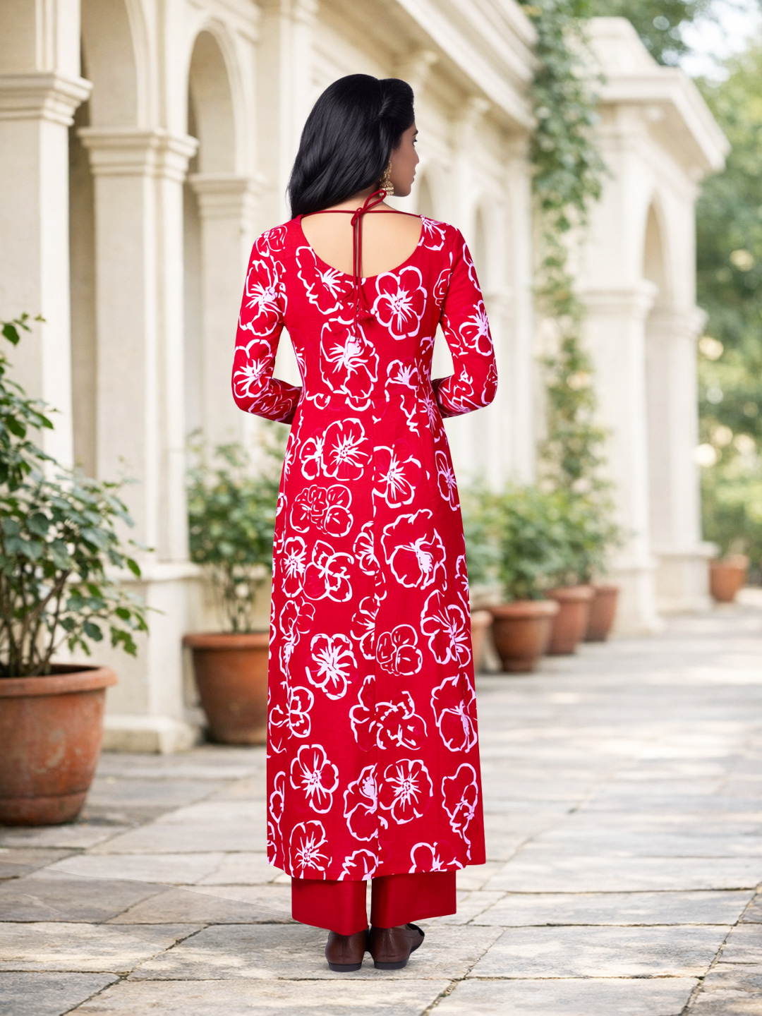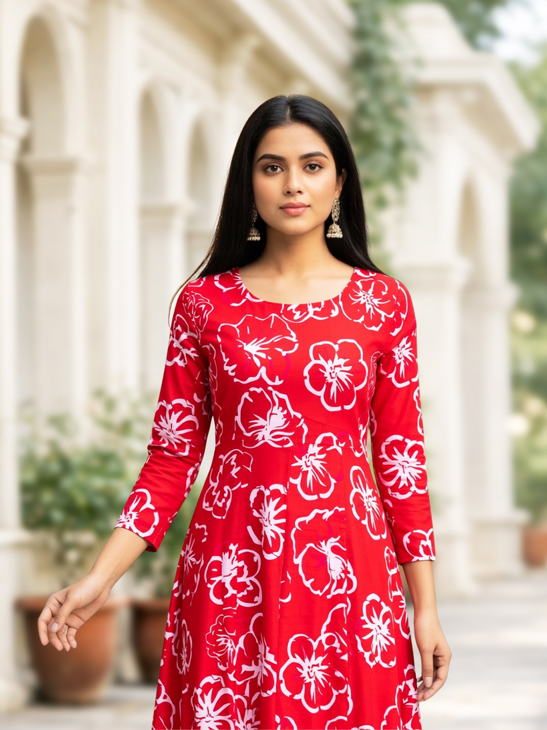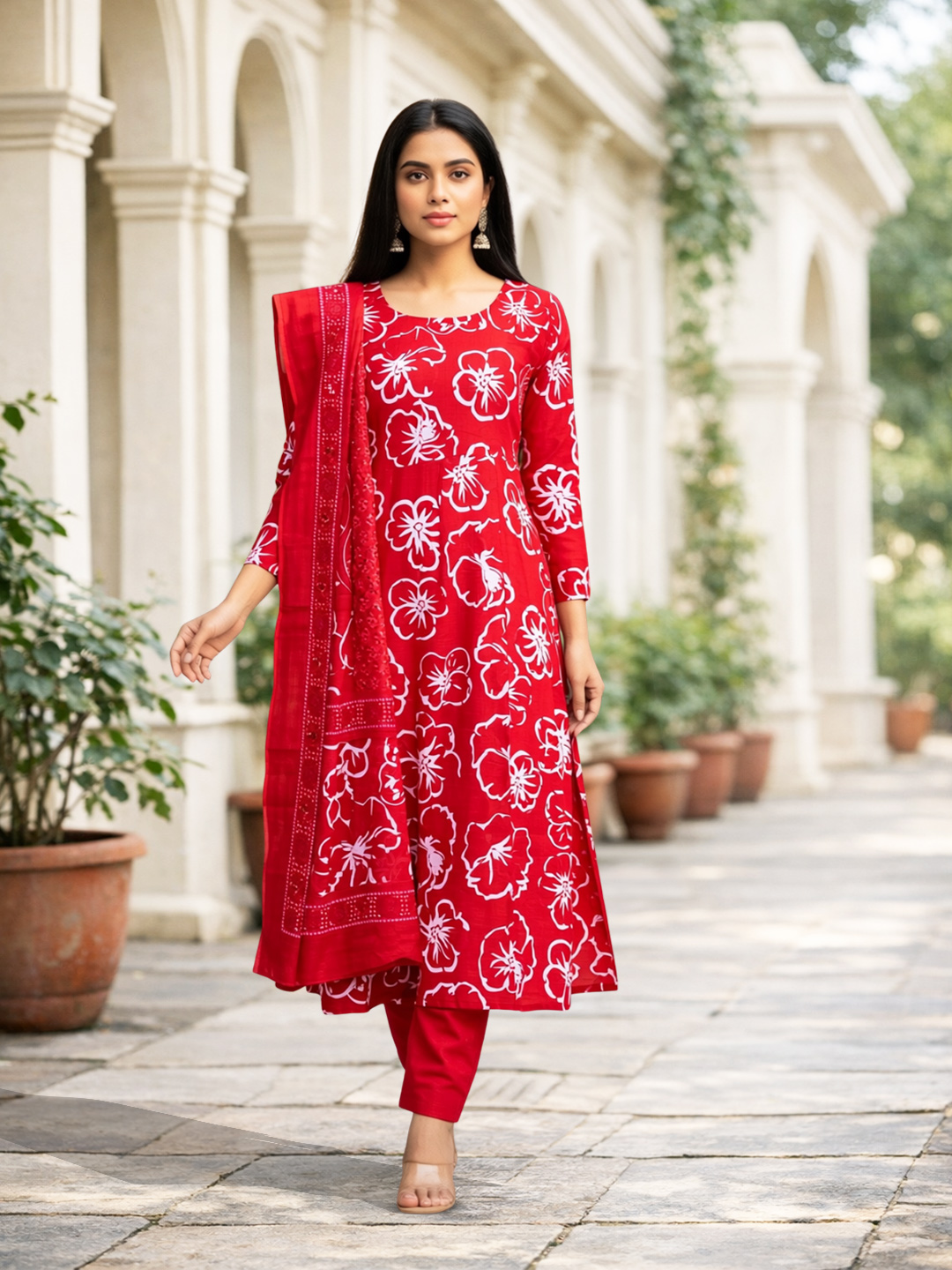 Step into effortless charm with this floral printed Anarkali suit set. Crafted from soft, breathable fabric, it keeps you comfortable even in warm weather. The flowing kurta adorned with delicate floral patterns pairs perfectly with the matching red salwar and a lightweight dupatta featuring intricate detailing for a complete, graceful look.