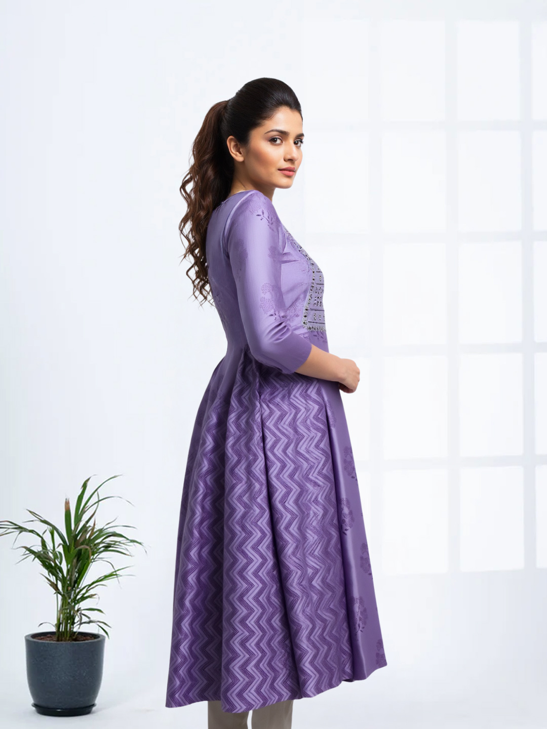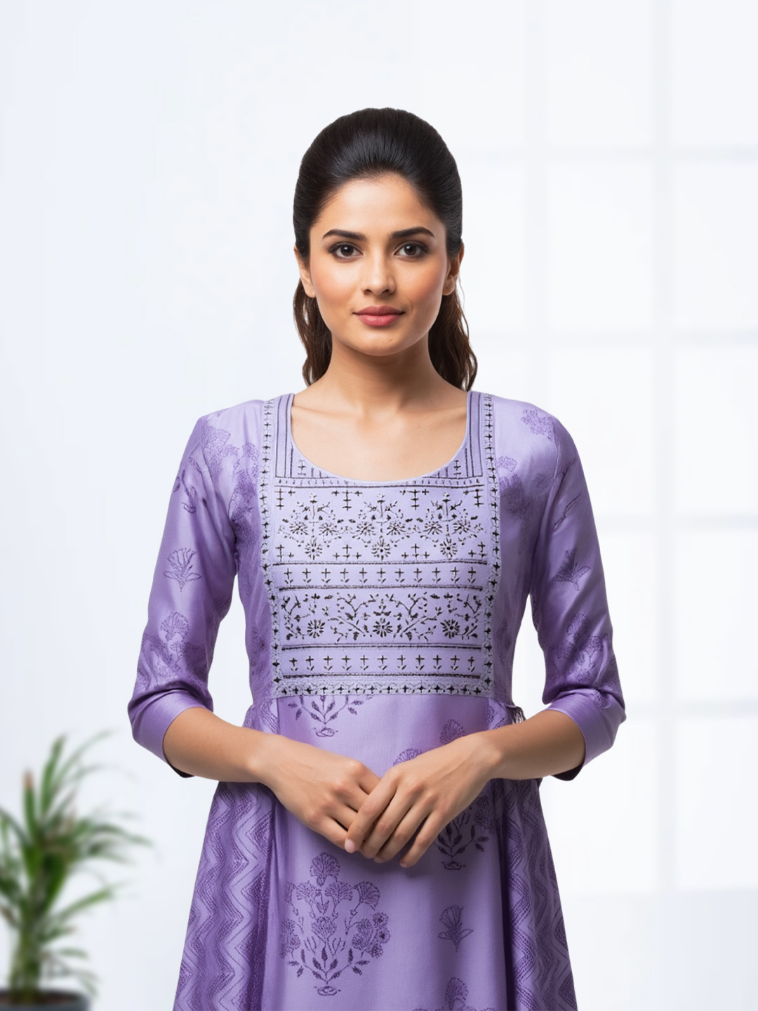 Crafted in a classic Anarkali style, this kurta features a generous flare that allows smooth movement and a flattering fall. The flared fit ensures comfort throughout the day while creating an elegant, flowy appearance.