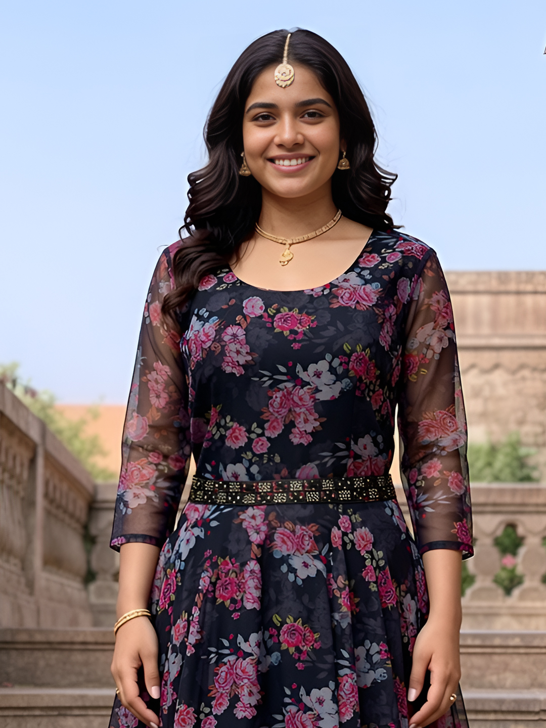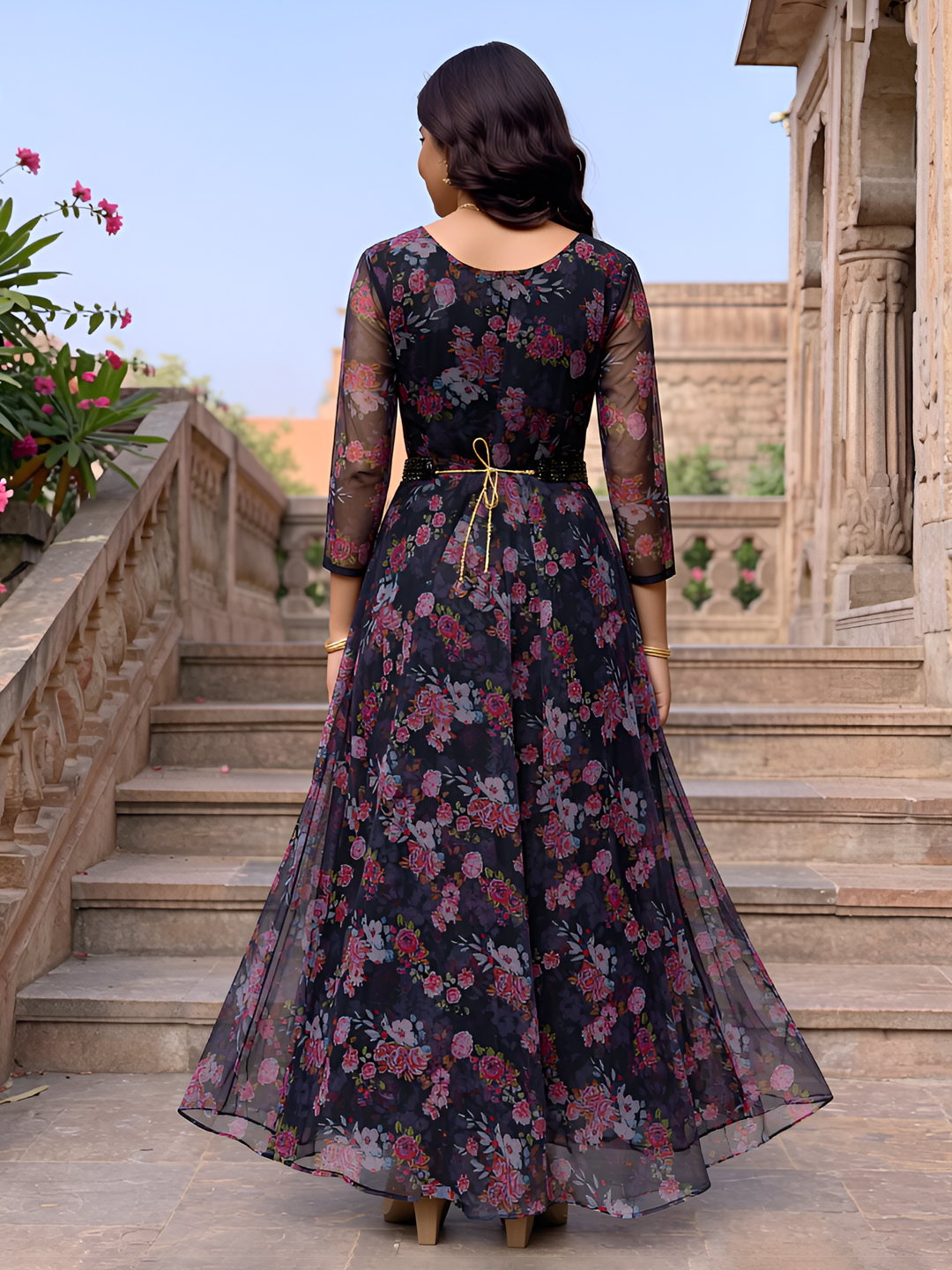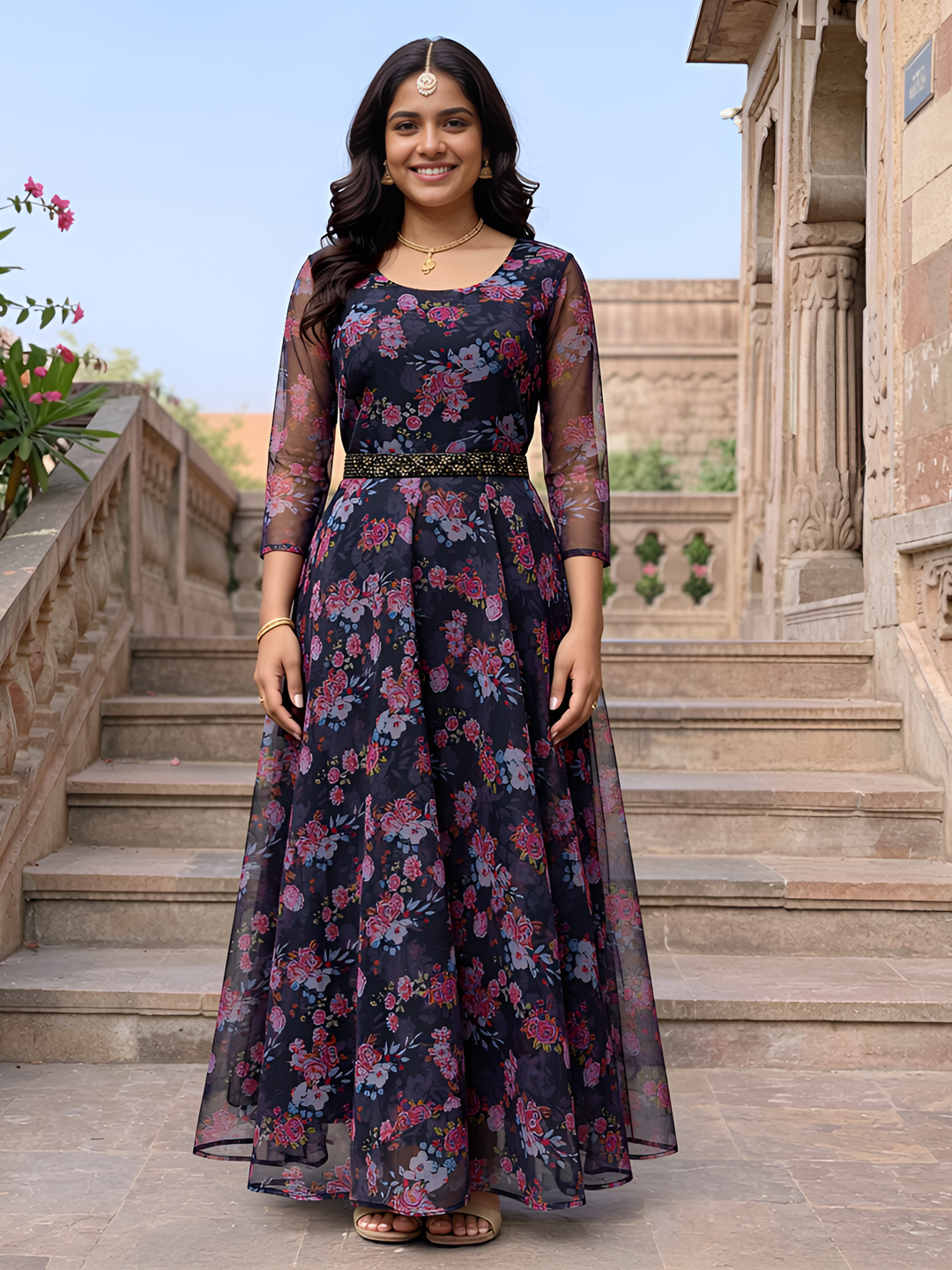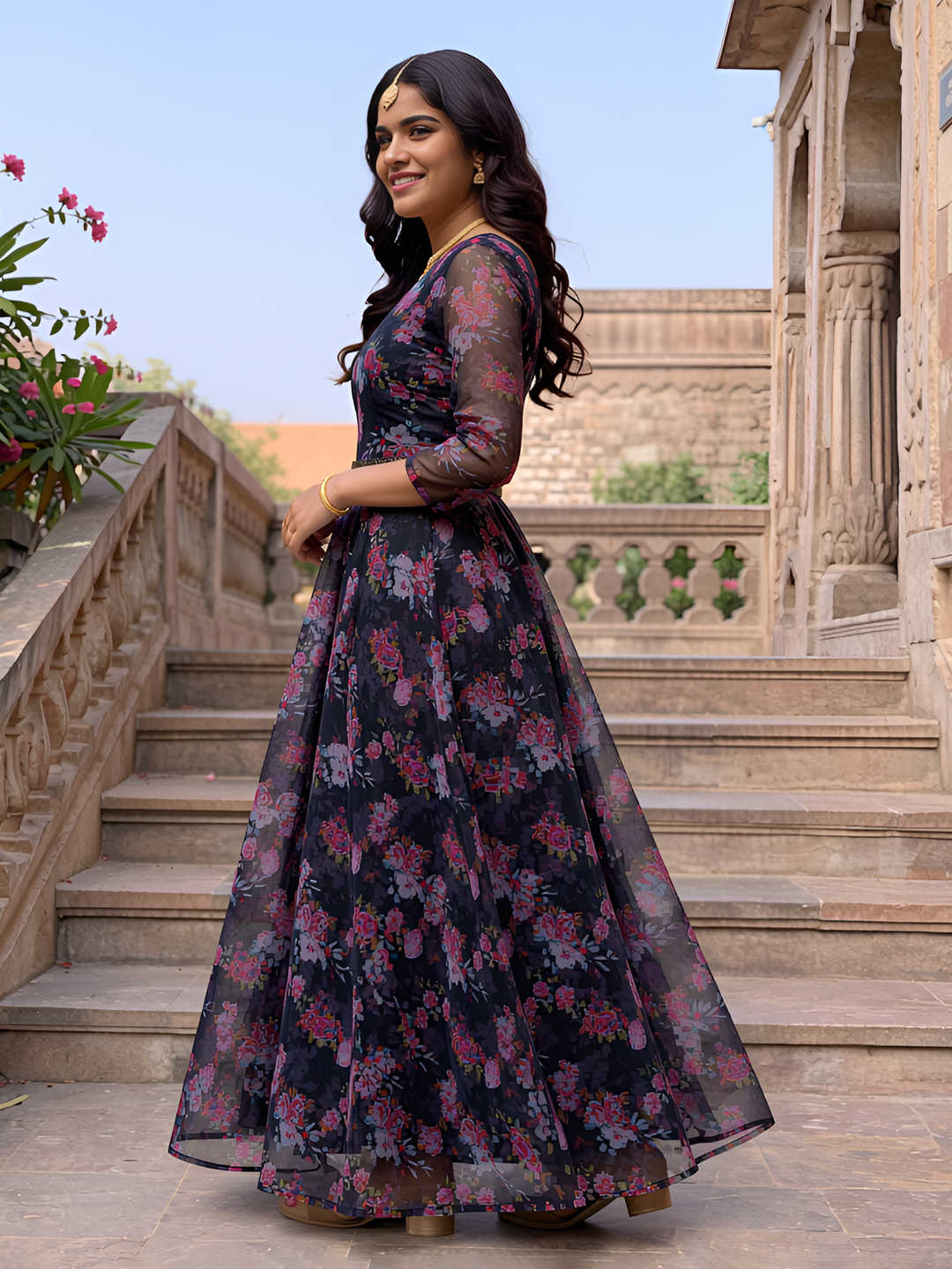 Elevate your ethnic wardrobe with this eye-catching floral gown. The round neckline flatters all body types, while the sheer sleeves bring subtle sophistication. Paired with a coordinating dupatta, this ensemble embodies elegance and makes every moment memorable.
