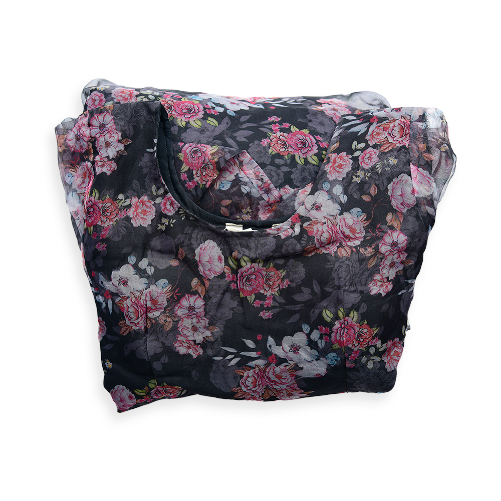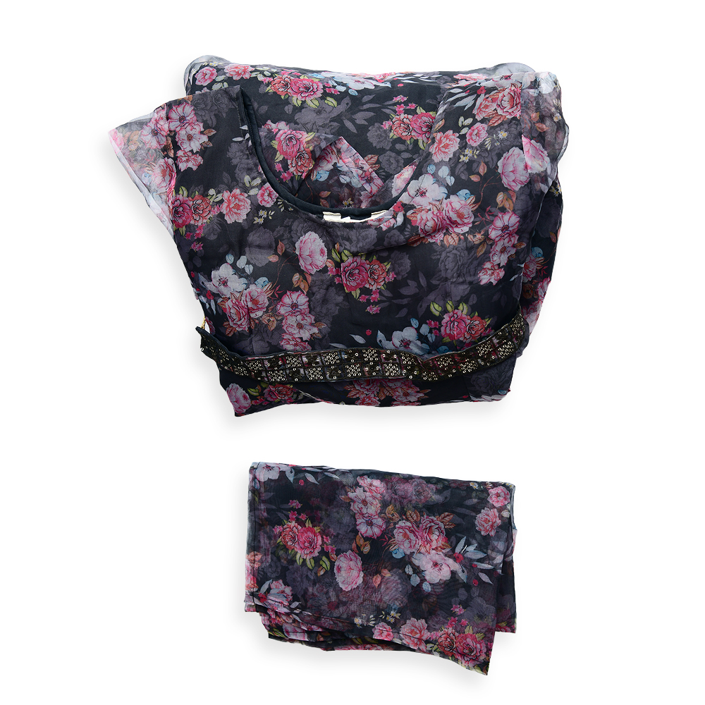 Step into a world of grace with this full-length floral gown. Crafted from lightweight, breathable fabric, it ensures comfort all day long. The multicolored floral print on a black base creates a striking visual, while sheer full-length sleeves and a classic round neckline add sophistication. Complete your look with the matching sheer dupatta for a timeless ensemble.