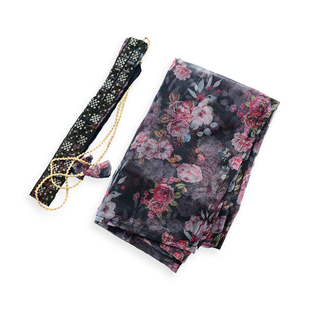 This full-length gown blends comfort and charm effortlessly. Lightweight fabric drapes beautifully, while the colorful floral pattern on a black base ensures you stand out. Sheer sleeves and a matching dupatta enhance the feminine appeal, making it a perfect choice for special celebrations.