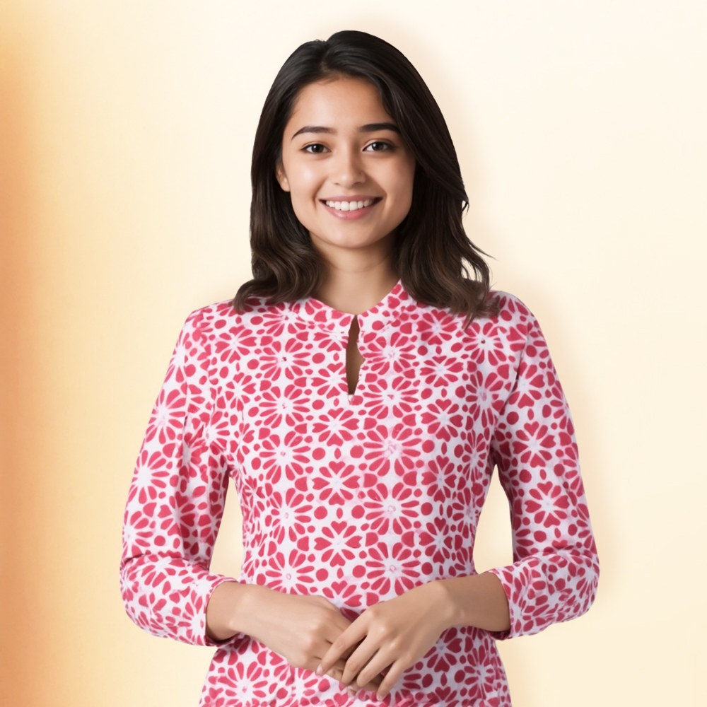 Crafted for the modern woman who embraces tradition with style, this floral printed kurta is a graceful blend of comfort and class. The Mandarin collar with a modest V-slit adds a refined touch, while soft floral patterns create an effortlessly elegant look.
