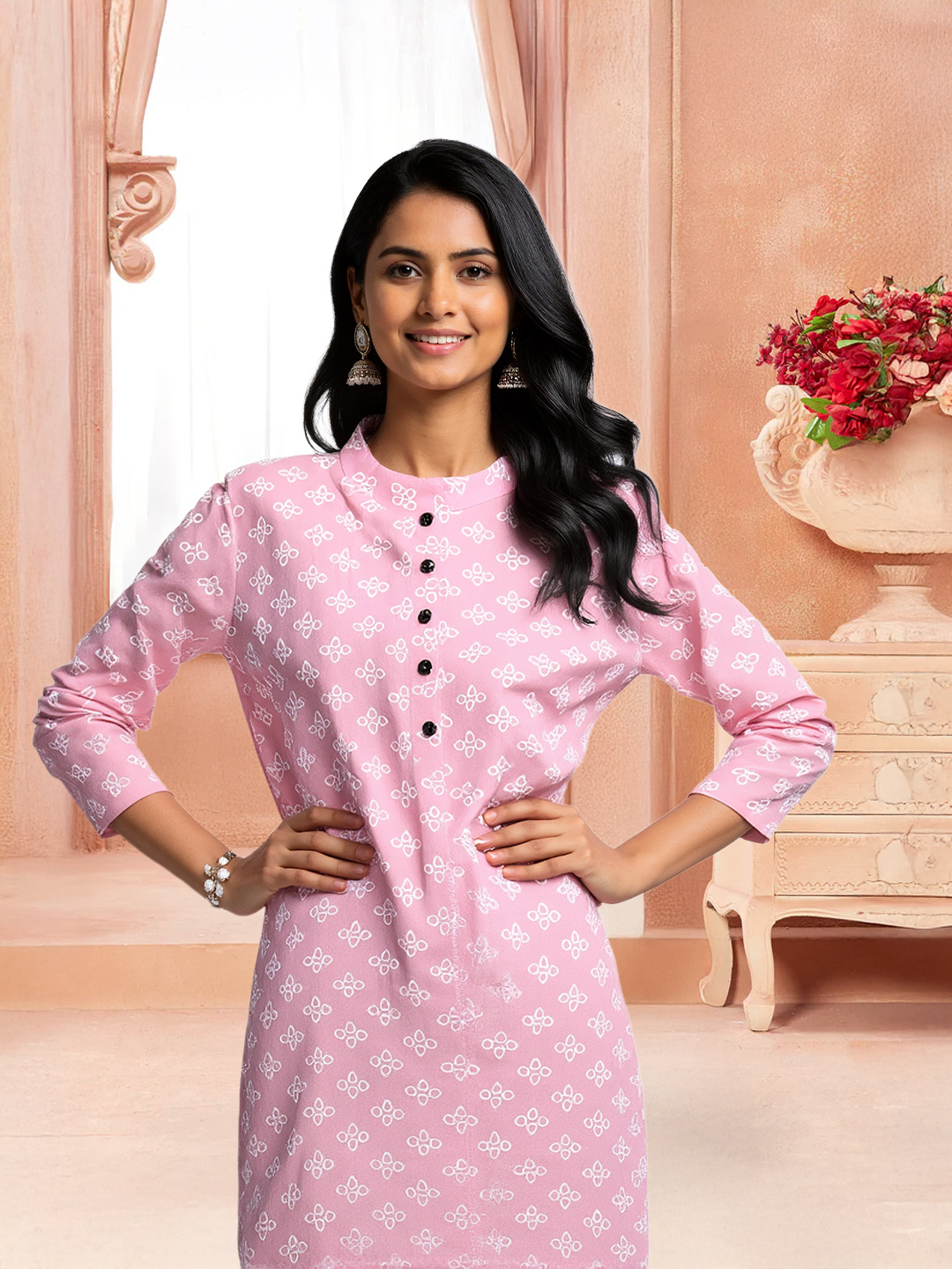 Featuring a graceful floral print and a smart mandarin neckline, this straight kurta brings together charm and confidence. The minimal design with structured detailing makes it ideal for office wear or brunches, keeping you stylish and comfortable all day long.