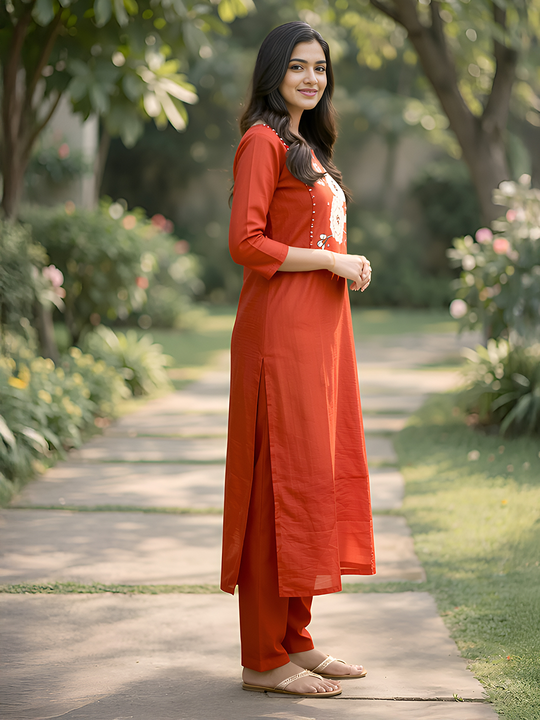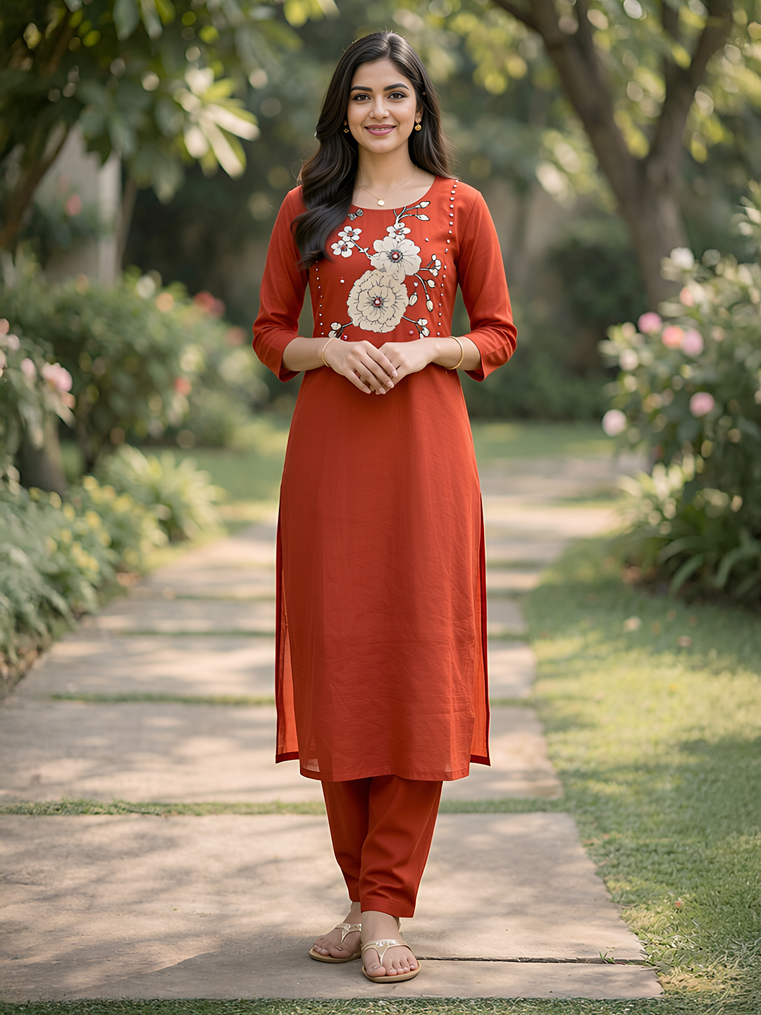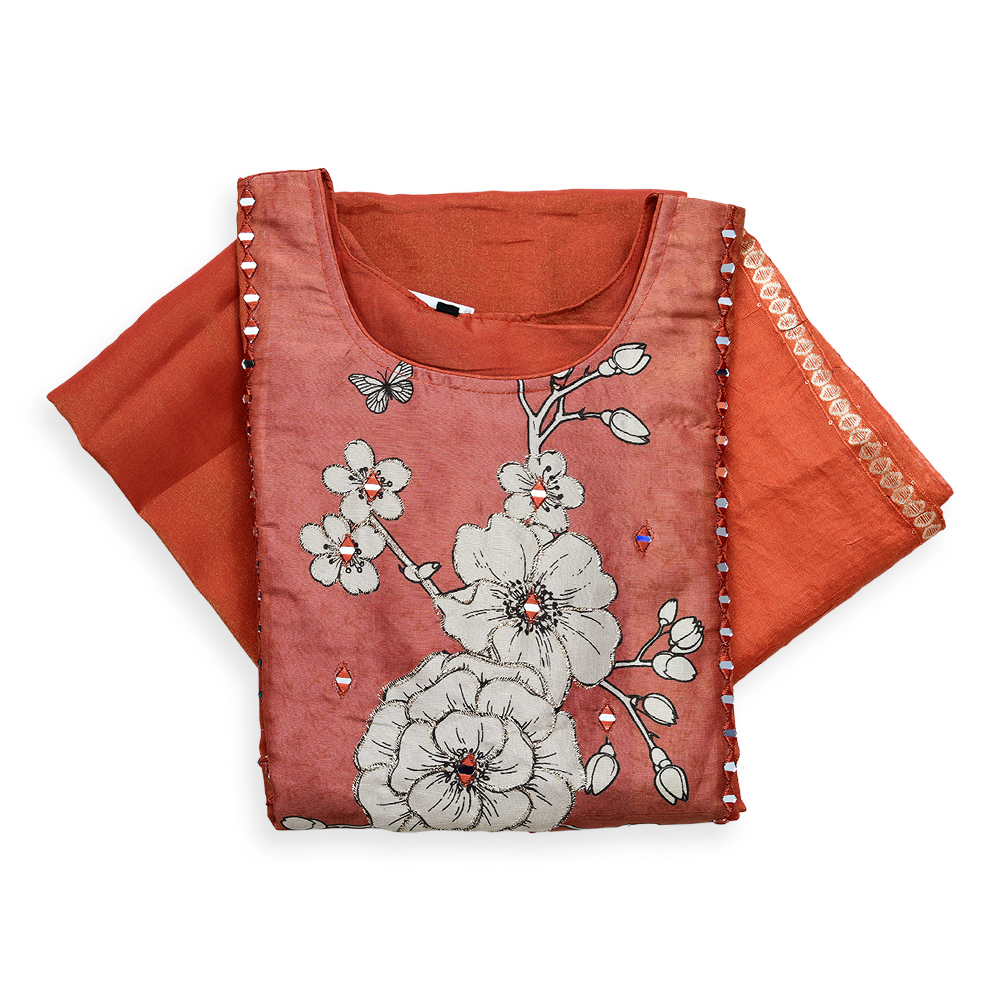 Blending tradition with contemporary style, this salwar suit set features a beautifully detailed floral front panel with mirror accents. The straight-cut design offers ease of movement, while the coordinated pants provide a clean, polished look. Finished with a textured dupatta, it’s an ideal choice for both casual and festive occasions.