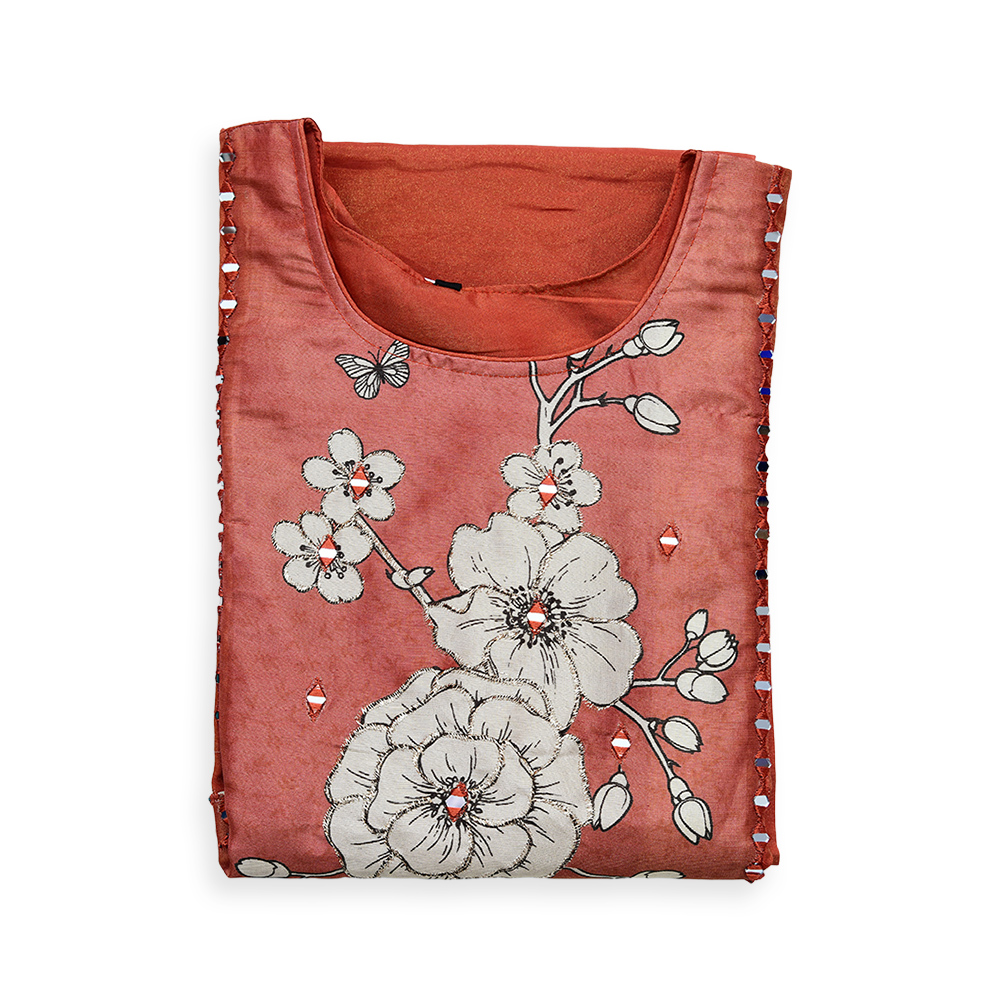 Designed for those who love minimal elegance, this outfit showcases floral artistry highlighted with gentle mirror work. The lightweight fabric keeps you comfortable all day, and the three-quarter sleeves add a modern edge. The striped dupatta and matching pants create a balanced and refined ensemble.