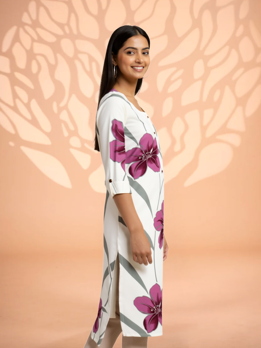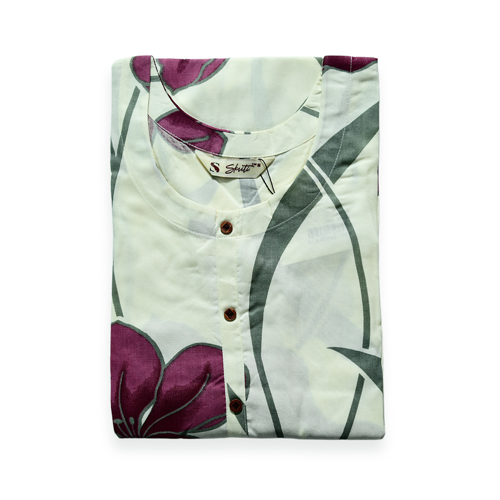 Add a touch of floral grace to your wardrobe with this beautifully crafted kurta. Made from premium fabric for a luxurious feel, the 3/4 sleeves and round neckline offer a sleek, refined silhouette. The all-over floral print brings a refreshing charm, ideal for both casual and dressier occasions.