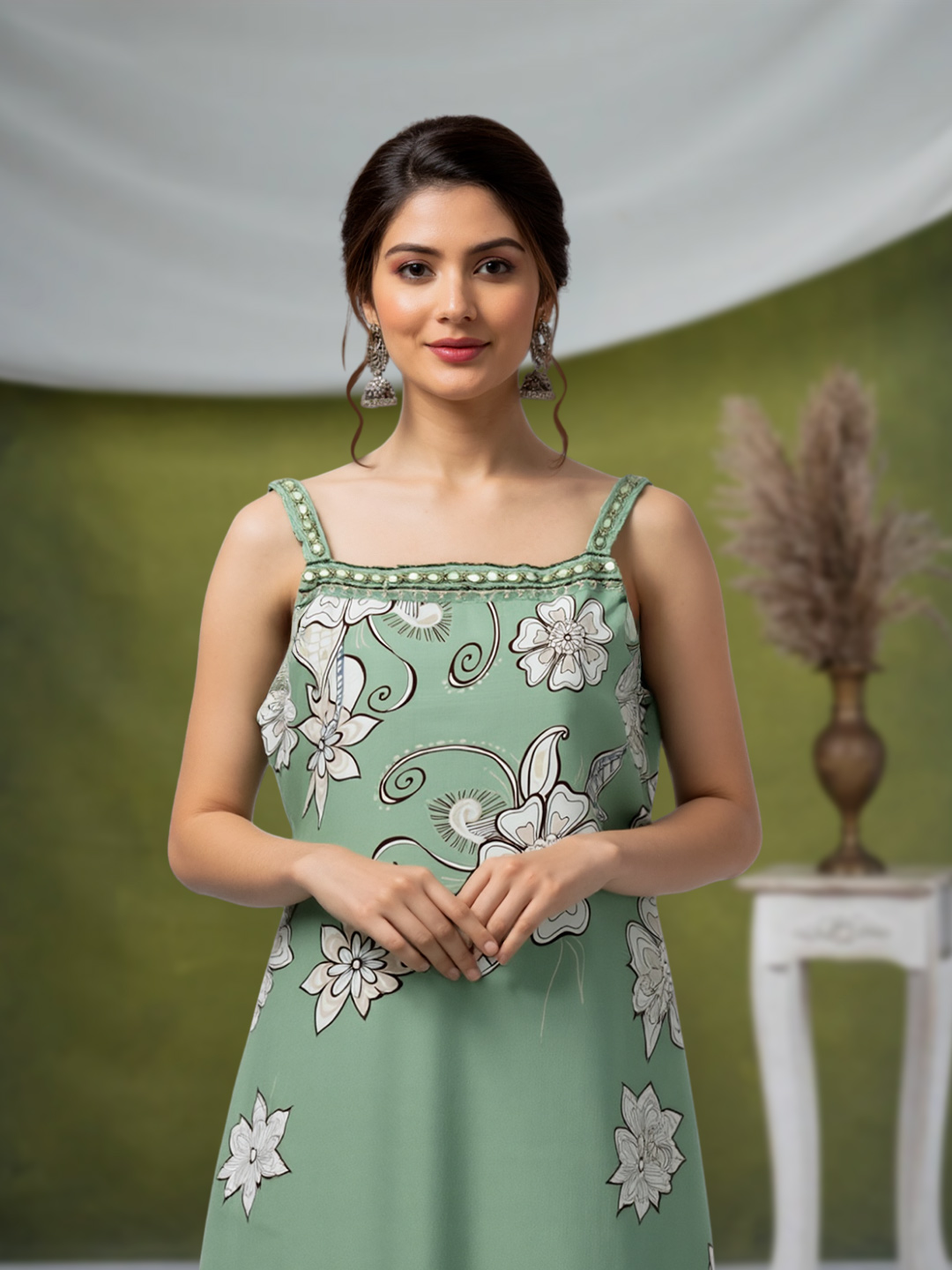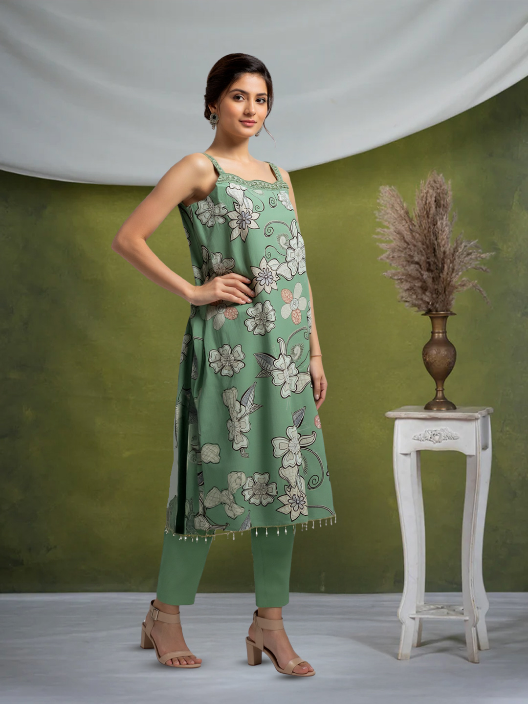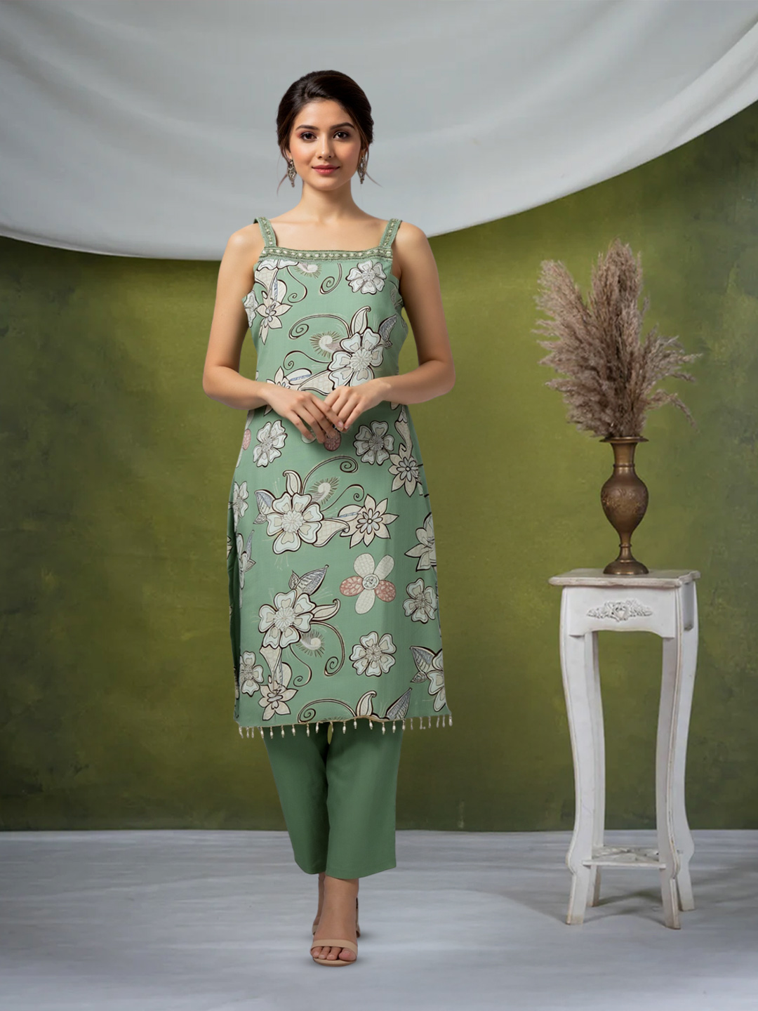 Refresh your ethnic wardrobe with this vibrant floral ensemble. The sleeveless kurta with a straight neckline and subtle floral print brings a fresh, youthful vibe. Paired with straight pants and a soft dupatta, this outfit ensures you stay effortlessly stylish from day to night.