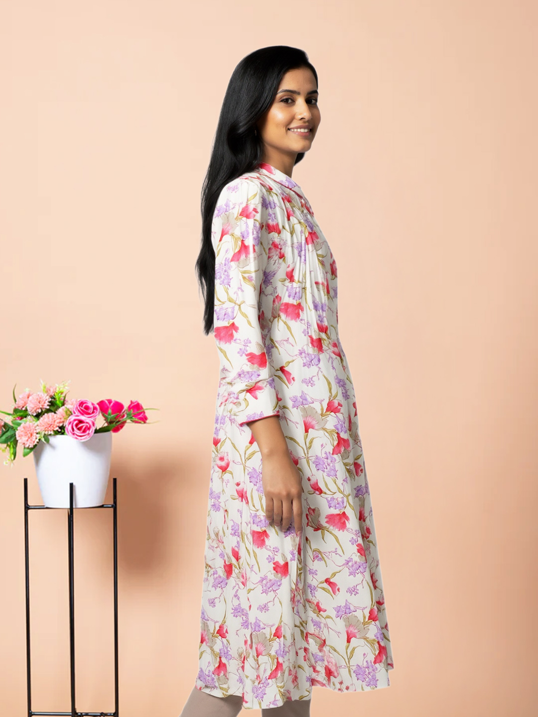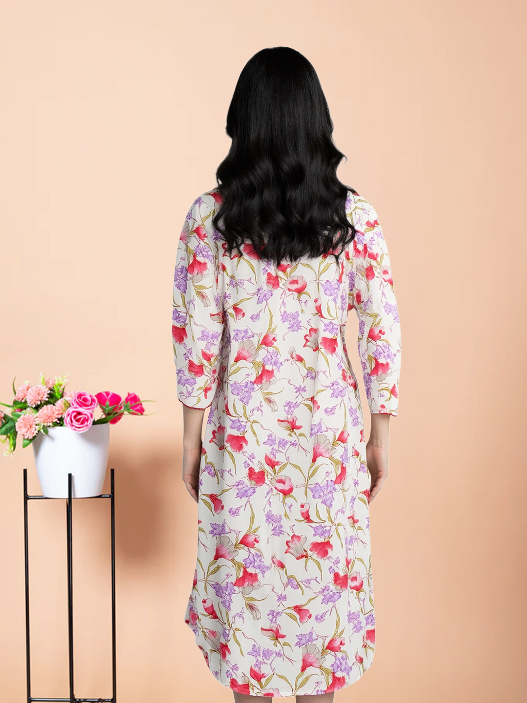 Embrace timeless beauty with a twist! The 3/4 sleeves and structured collar bring a stylish edge to the soft floral print — a must-have for the fashion-forward woman.