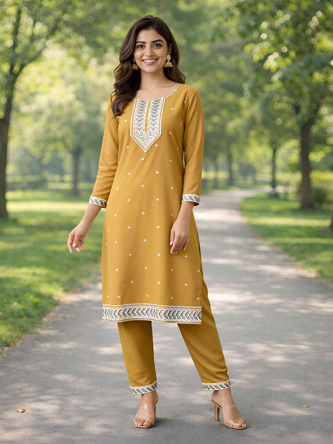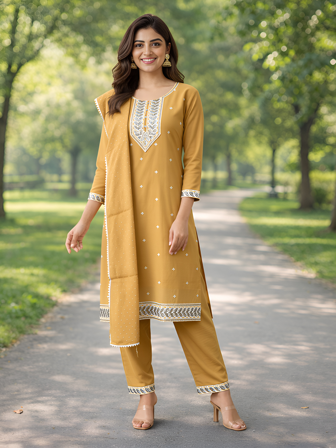 Crafted for modern women who value both style and ease, this straight-cut salwar suit set offers a flattering yet comfortable fit. The delicate embroidery on the yoke enhances its appeal, while the lightweight dupatta and coordinated borders complete the look. Ideal for long hours without compromising on style.