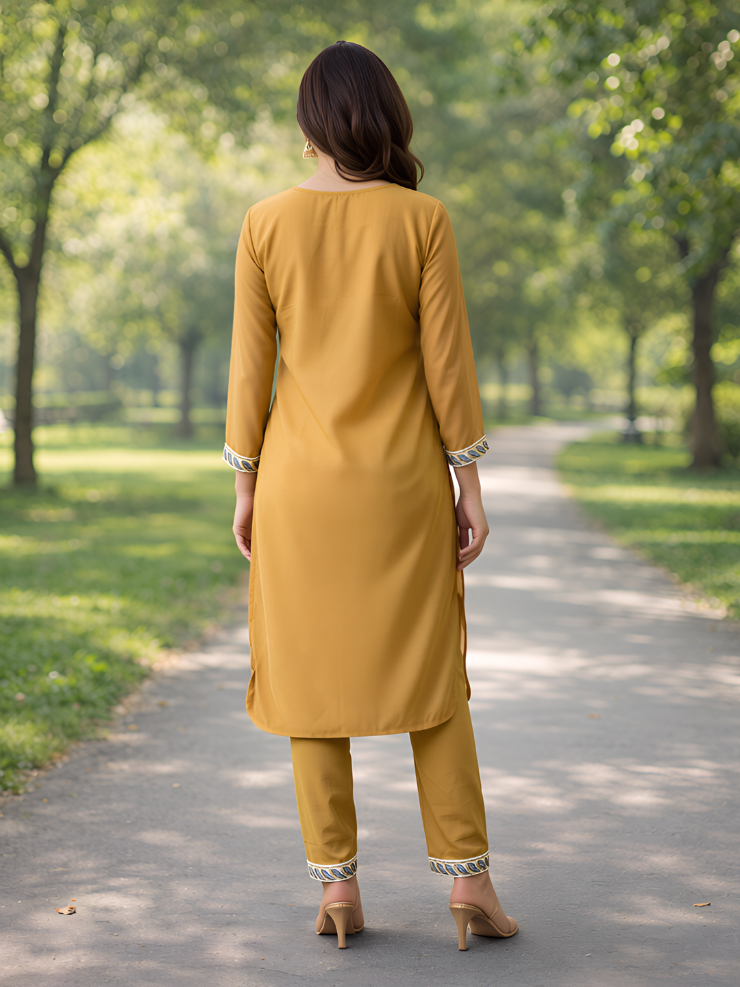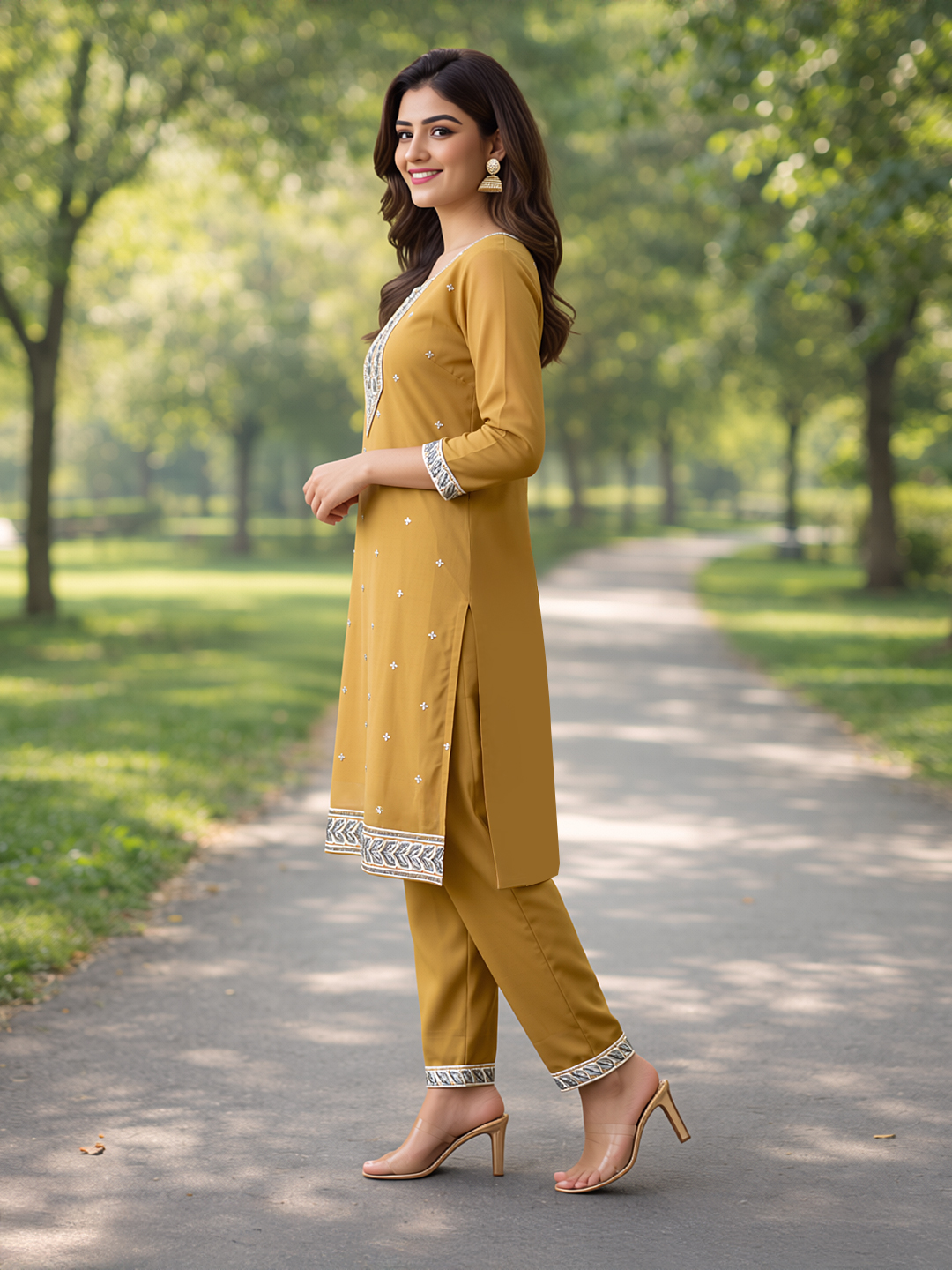 This 3-piece set brings together a stylish kurta, matching pants, and an elegant dupatta to create a perfectly coordinated outfit. Designed with attention to detail—from the neckline embroidery to the hemline accents—it offers a harmonious blend of tradition and contemporary design.