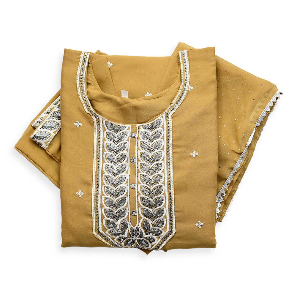 Elevate your ethnic wardrobe with this floral sequinned embroidered salwar suit set, designed for effortless sophistication. The intricately detailed neckline adds a refined charm, while subtle motifs across the fabric create a graceful balance. Paired with a soft, flowy dupatta, this 3-piece ensemble is perfect for both casual elegance and festive moments.