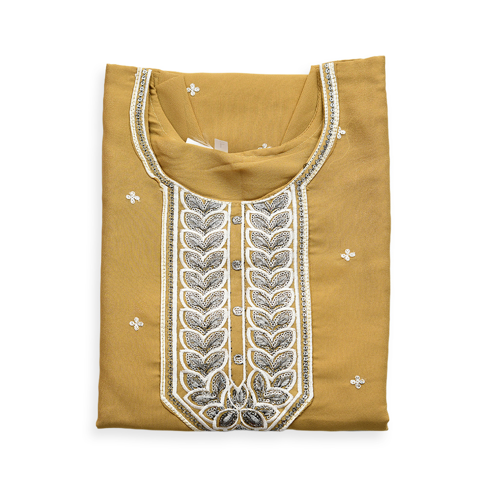 Step into understated luxury with this beautifully designed suit set featuring minimal floral motifs and fine sequinned embroidery. The three-quarter sleeves and decorative borders add a polished finish, making it a versatile choice for small gatherings, office wear, or festive days.