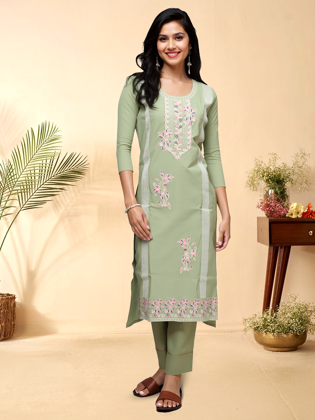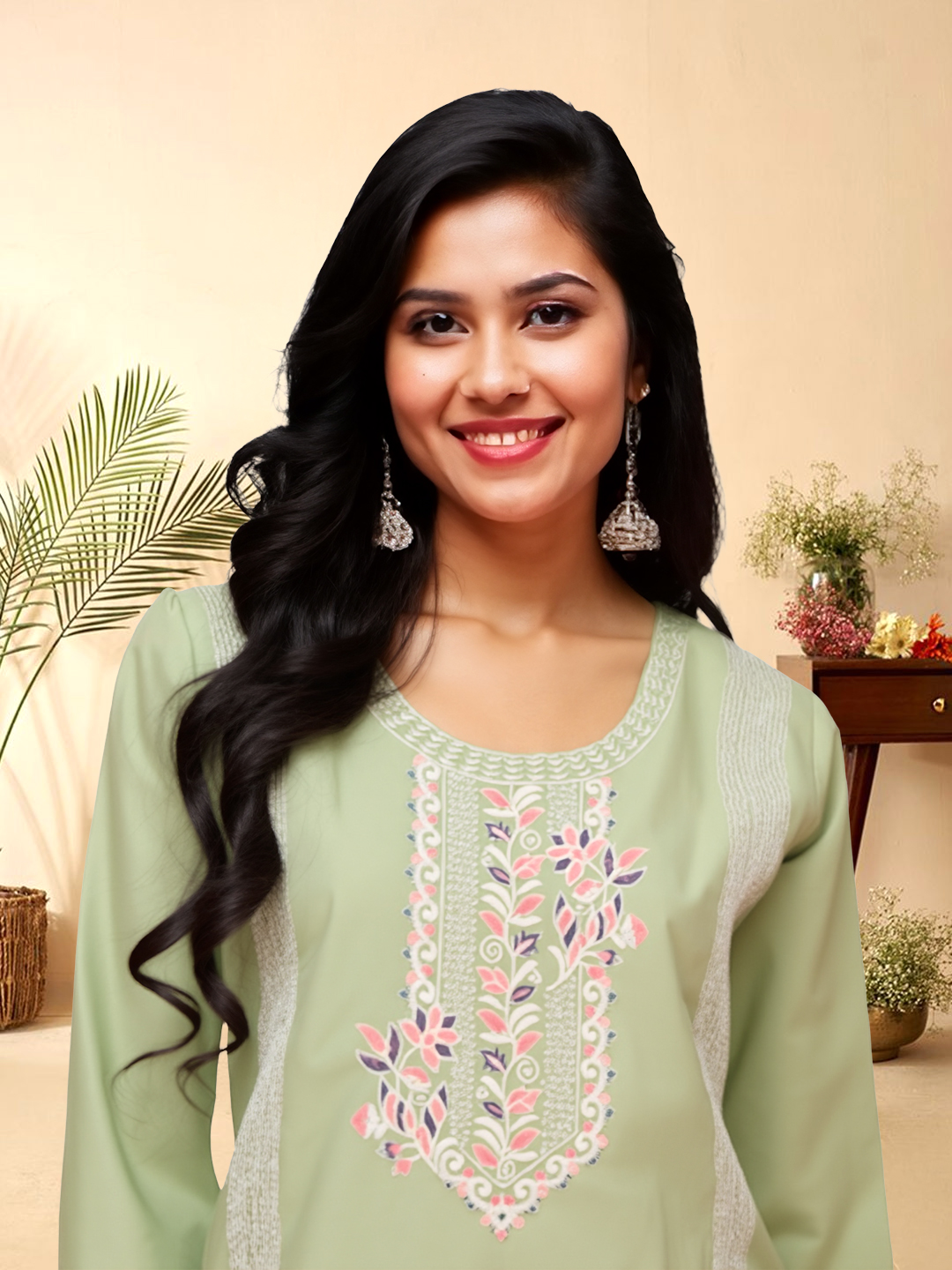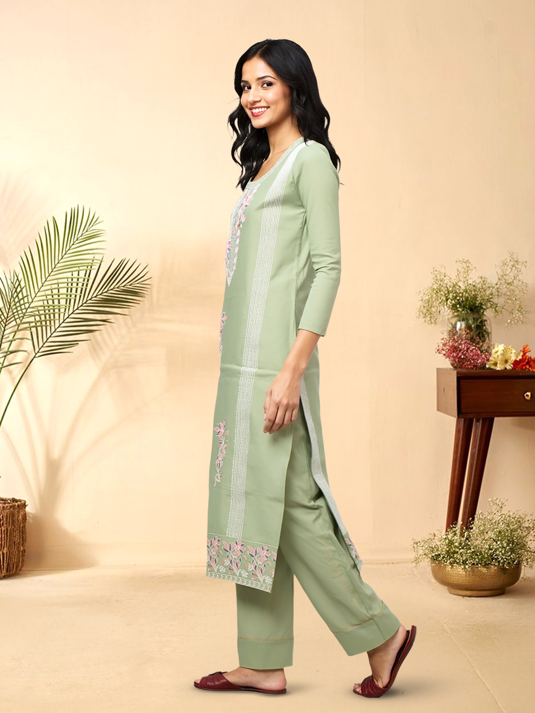 Delicately adorned with floral thread embroidery, this pastel green kurta set blends traditional charm with modern elegance. A graceful choice for festive occasions and elegant daytime events.