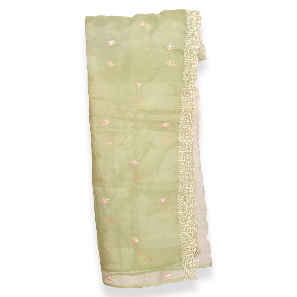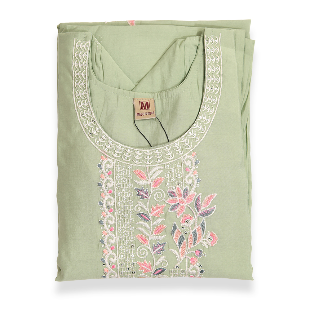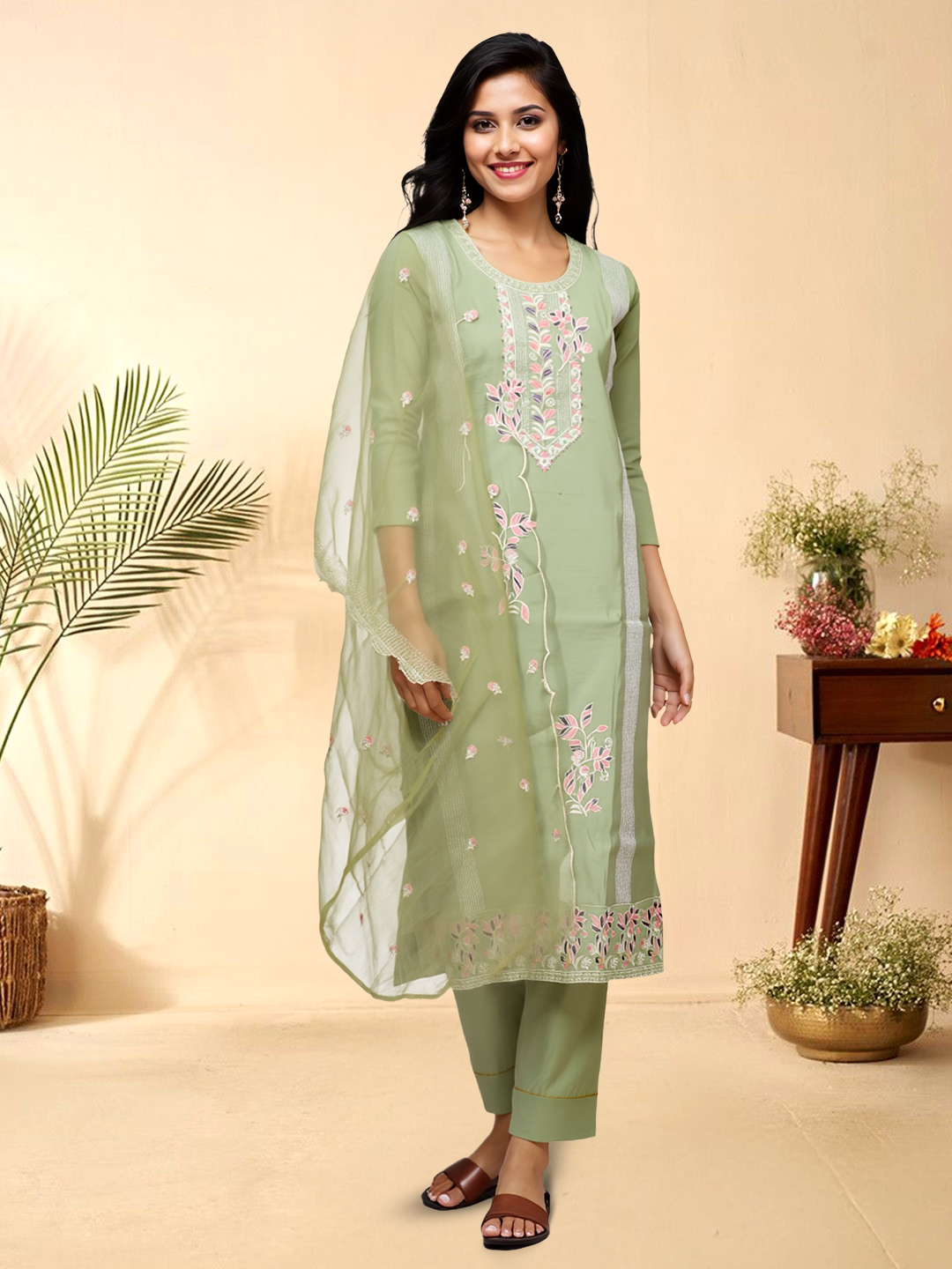 Delicately adorned with floral thread embroidery, this pastel green kurta set blends traditional charm with modern elegance. A graceful choice for festive occasions and elegant daytime events.