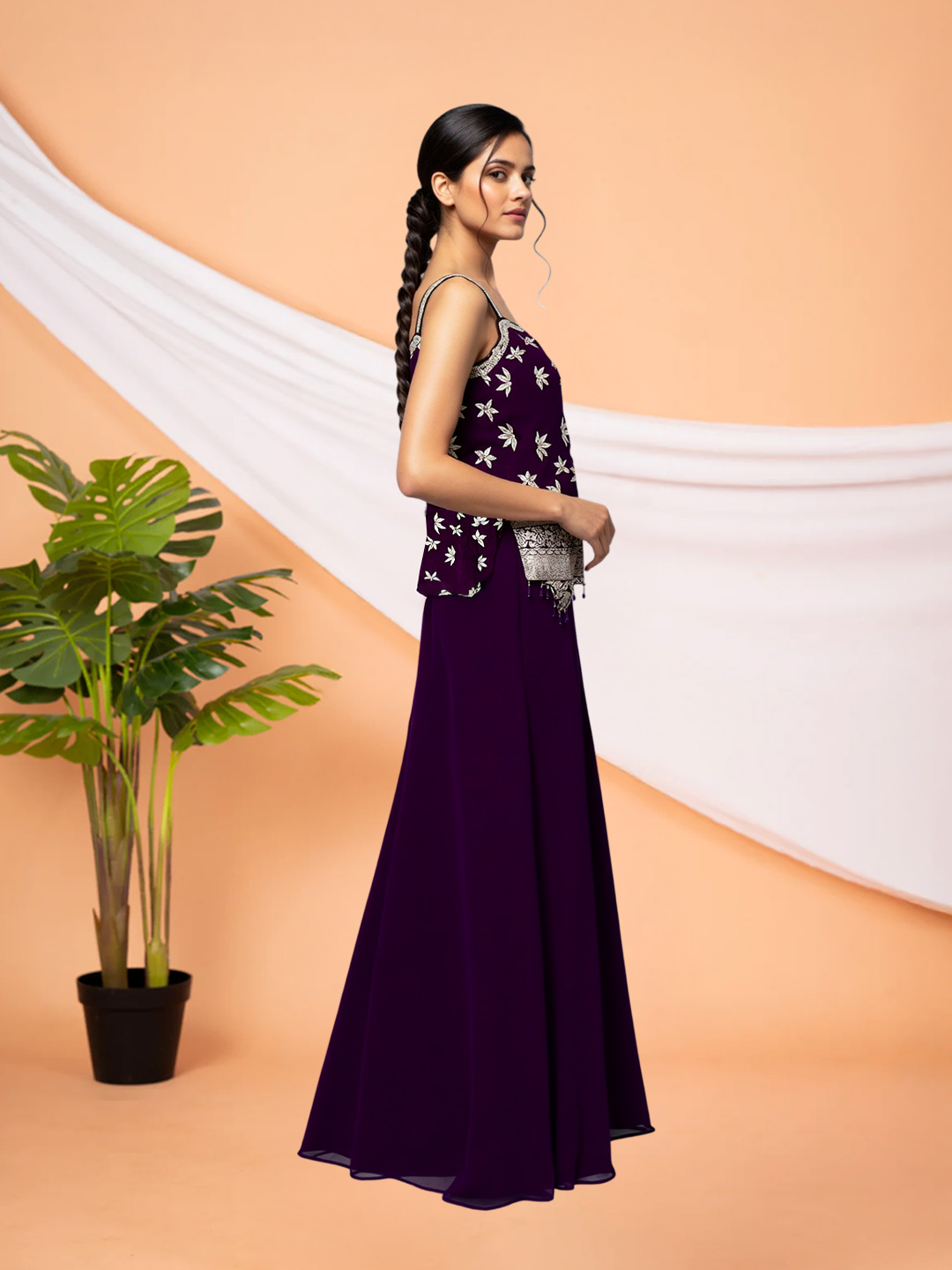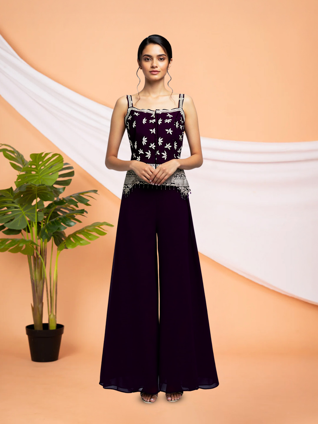 This Floral Thread Mirror Work Short Top with Sharara & Dupatta Set is designed for effortless festive charm. Crafted from a soft, flowy fabric, it ensures comfort while enhancing graceful movement. The bodice and waist are adorned with intricate metallic floral embroidery and delicate mirror work, adding a radiant sparkle perfect for special occasions.