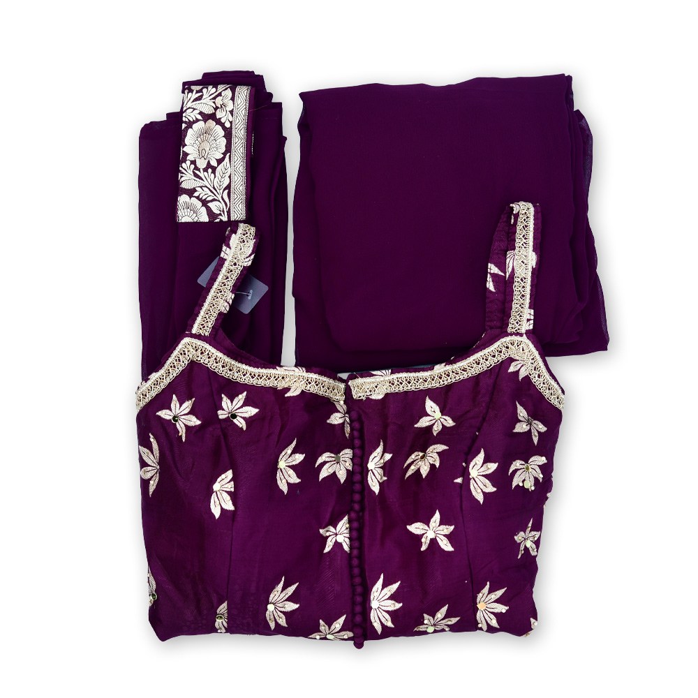 Step into sophistication with this Floral Thread Mirror Work Sharara Set. The metallic floral embroidery and subtle mirror detailing on the bodice and waist add a touch of luxury, while the flowing sharara and dupatta ensure a graceful, flattering silhouette—perfect for weddings, festivals, and festive soirées.