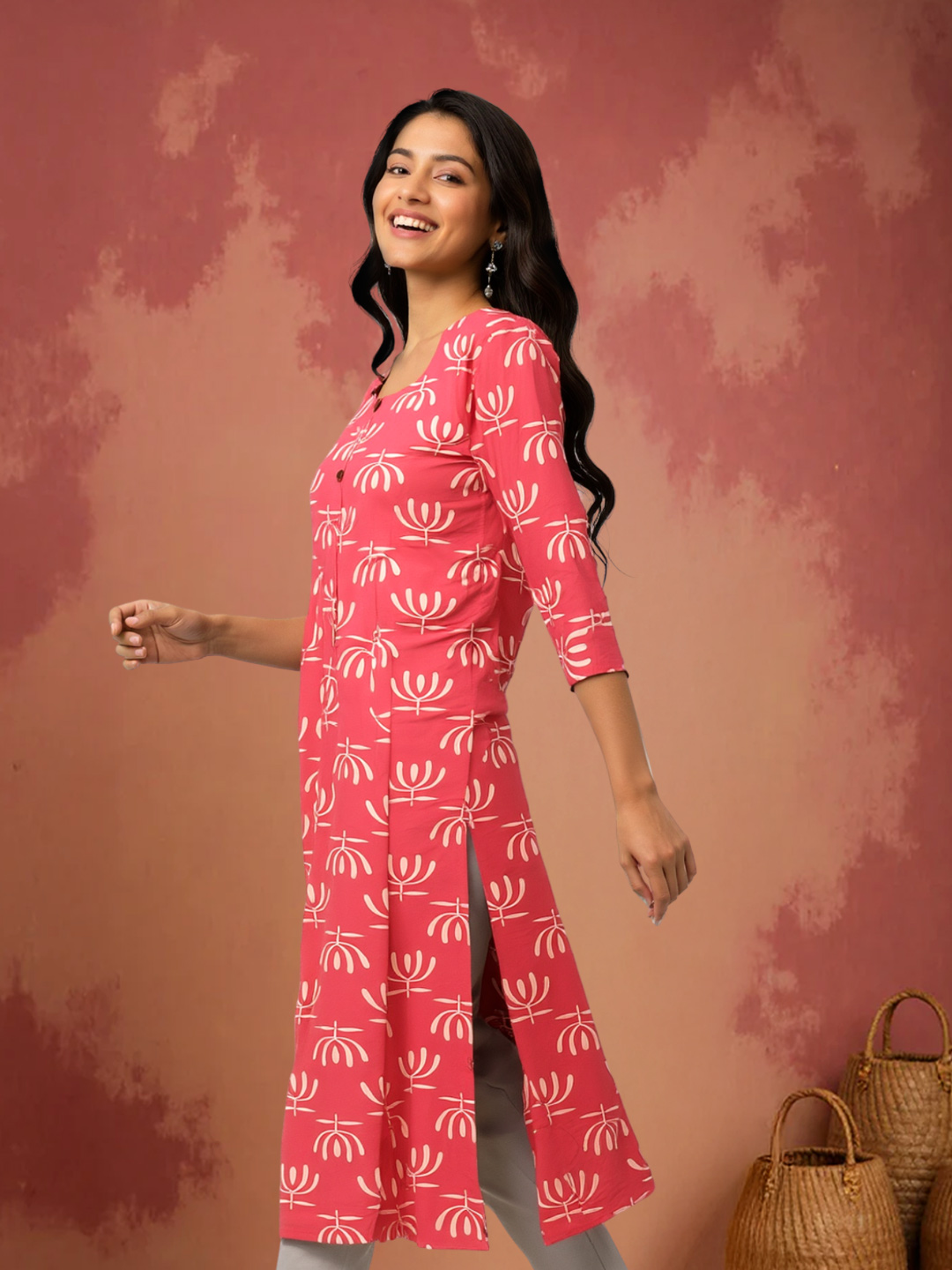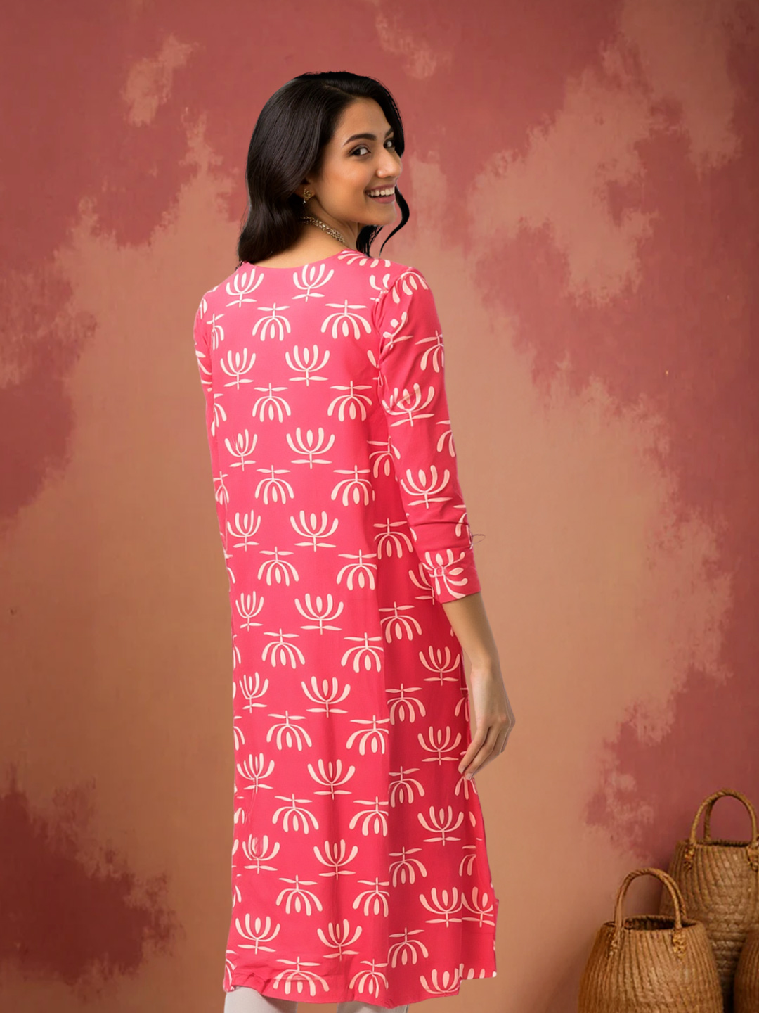Add a fresh twist to your wardrobe with this kurta. Its geometric floral print, 3/4 sleeves, and round neck combine comfort with effortless style.