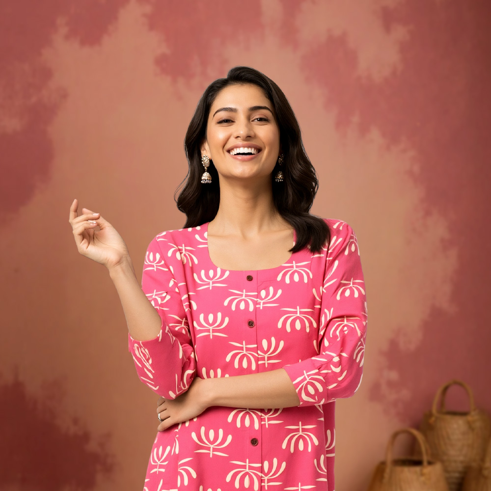 This kurta blends modern prints with timeless design. The geometric floral pattern, round neckline, and 3/4 sleeves make it perfect for casual and semi-formal occasions.