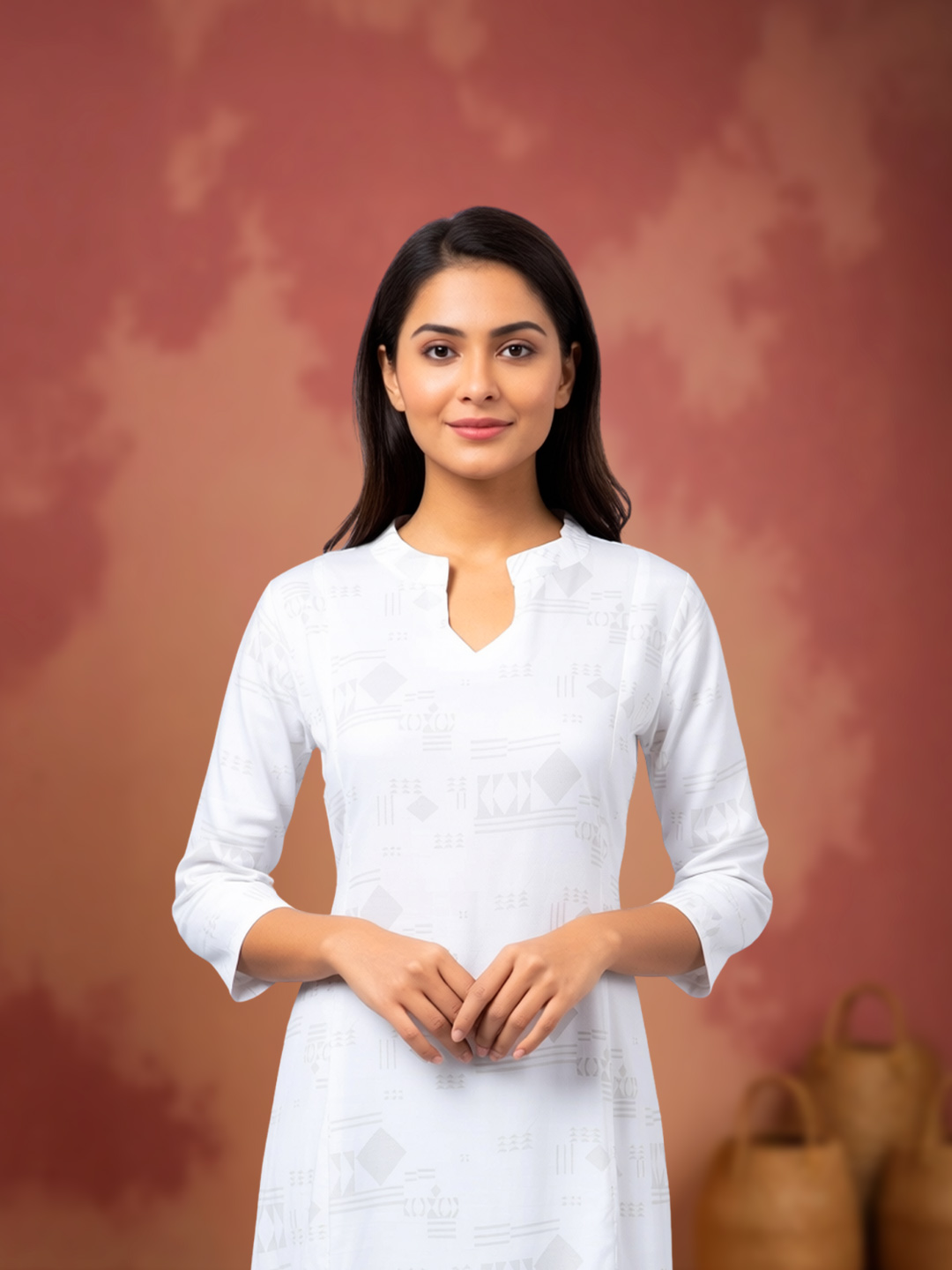 Bring subtle elegance to your wardrobe with this calf-length straight-cut kurta set. The all-over geometric print adds visual interest without overpowering the design. A sleek notch neckline and three-quarter sleeves create a balanced, contemporary look. Made from lightweight fabric, it offers exceptional comfort, while the matching straight pants enhance its clean and structured silhouette.