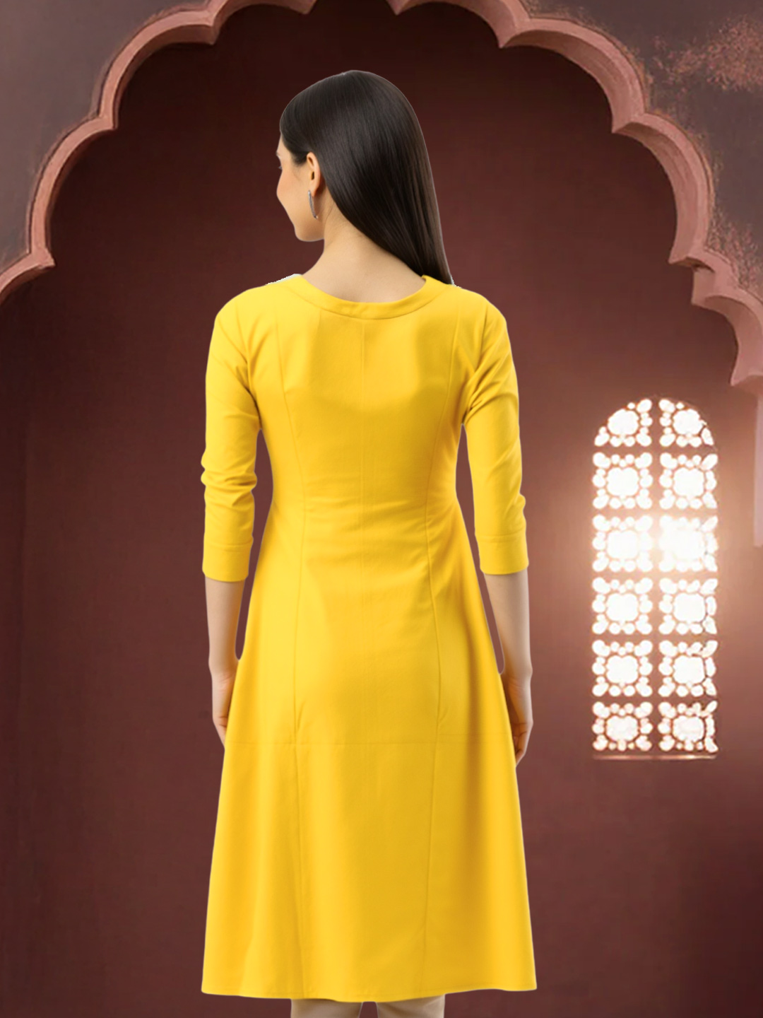 Designed for the fashion-forward woman, this straight-cut kurta combines comfort and style. The V-neckline flatters every shape, while the 3/4 sleeves and high-quality fabric make it perfect for work or weekend outings.