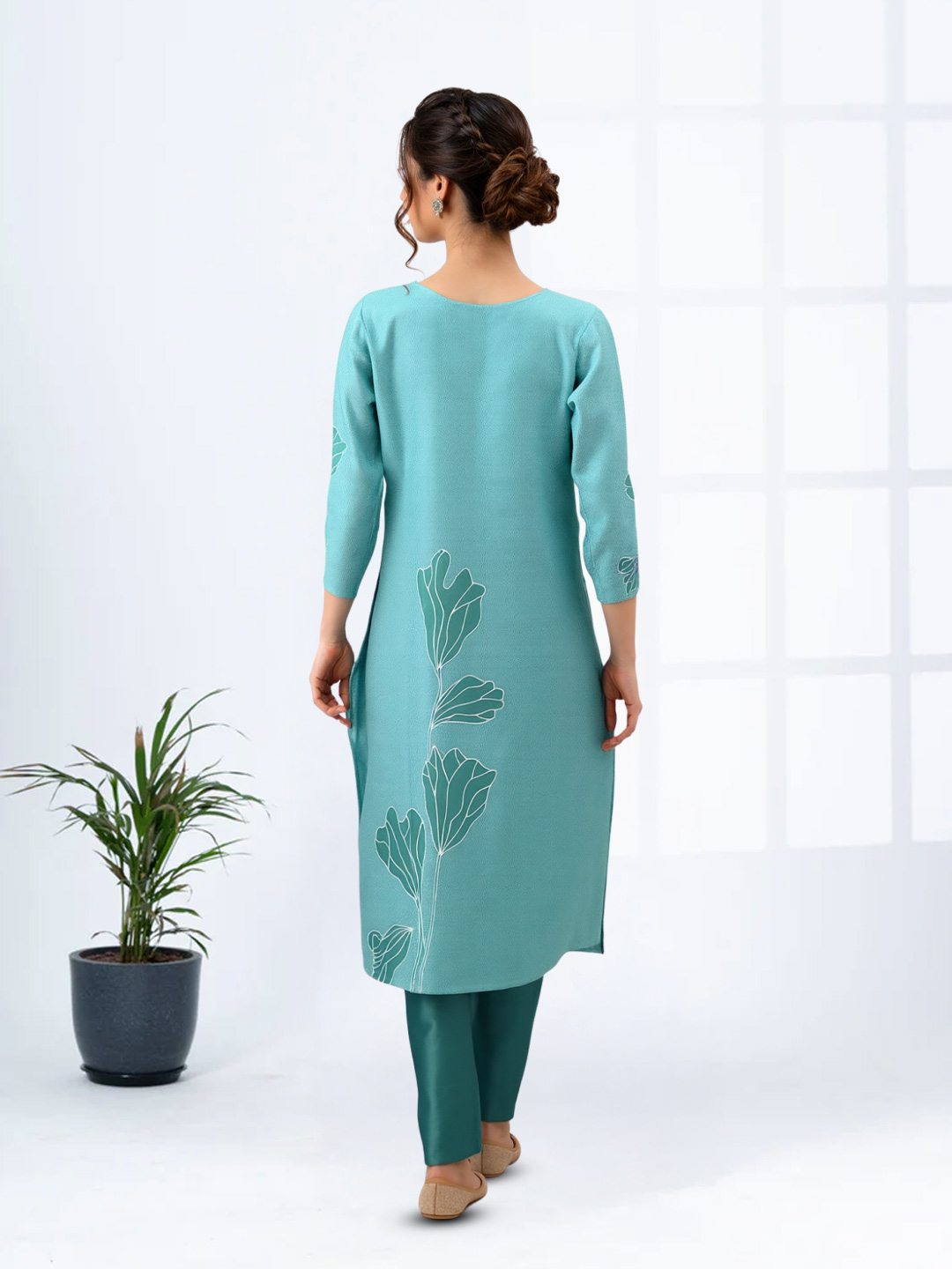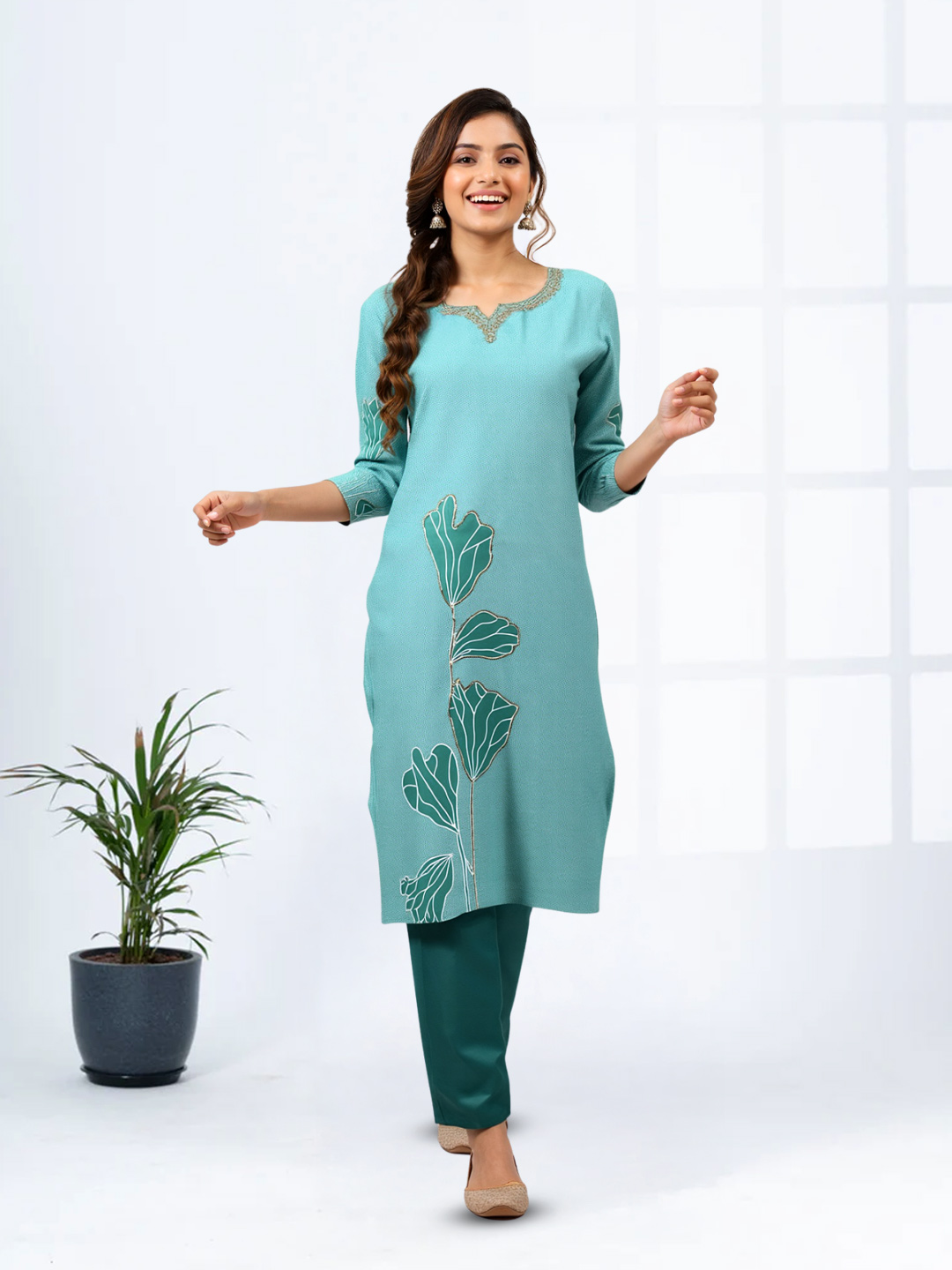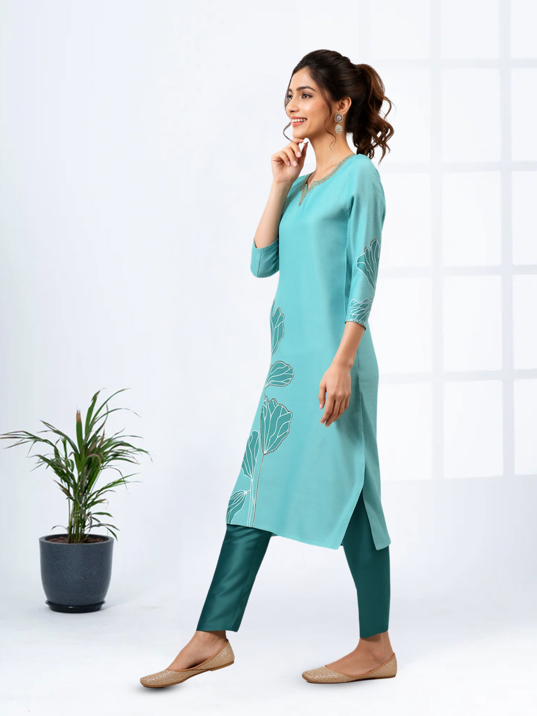 This ethnic kurta ensemble combines elegance and comfort. The golden embroidered notched neckline, coordinated straight pant, and lightweight dupatta make it ideal for celebrations or family gatherings.
