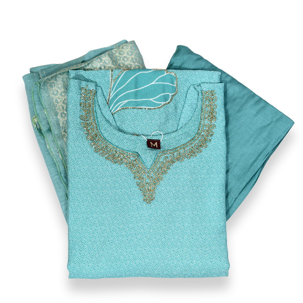 Designed for elegance and comfort, this notched neck kurta set features delicate golden embroidery, a matching straight pant, and a soft, traditional dupatta — perfect for festive occasions or special events.