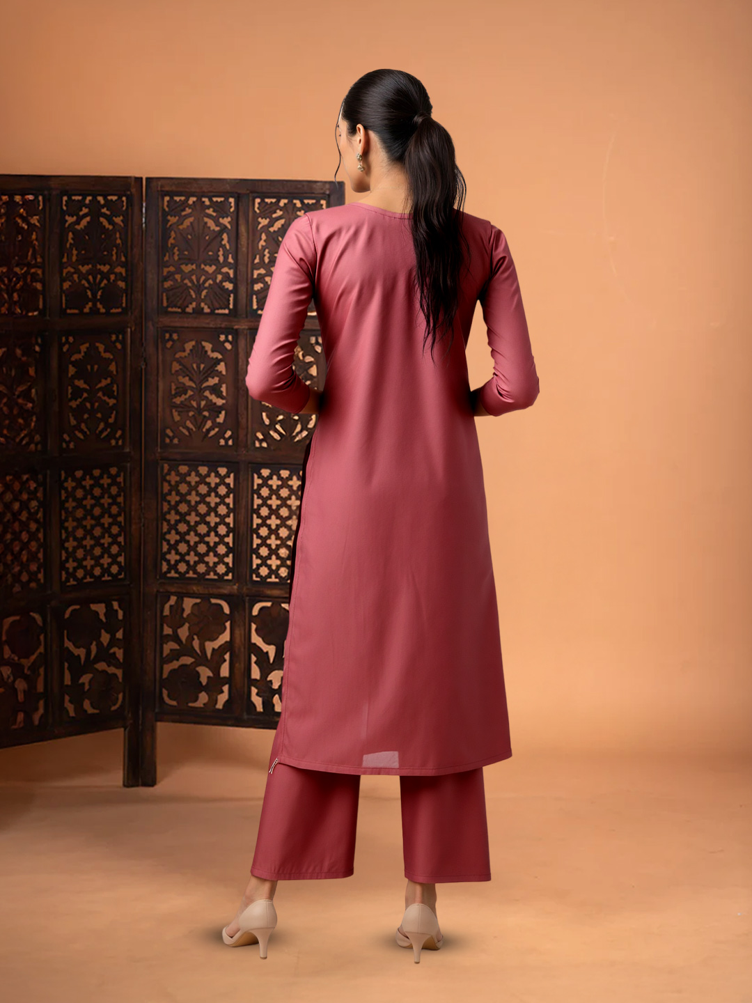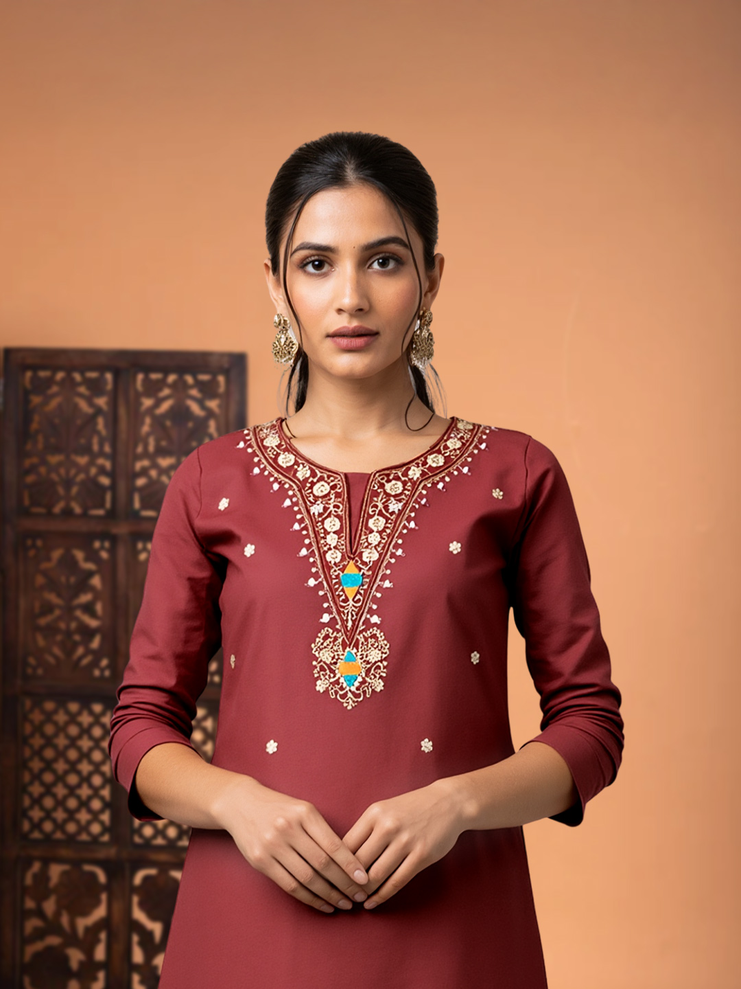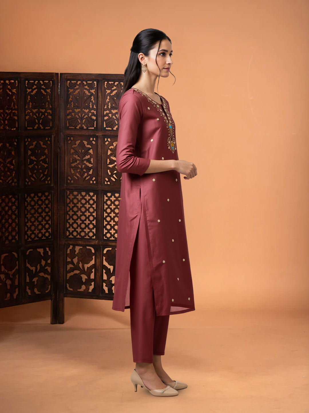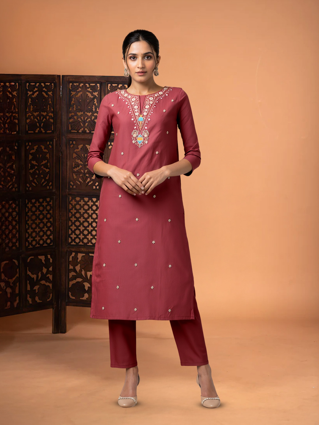 Celebrate refined style with this beautifully crafted salwar suit set. The notched neckline with delicate embroidery enhances its elegance, complemented by minimalist embellishments on the body. Straight pants, a luxurious dupatta, and 3/4 sleeves complete this graceful ensemble.
