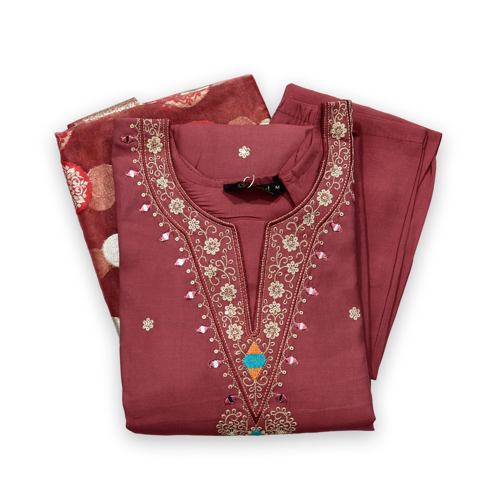 Perfect for celebrations or casual ethnic wear, this set showcases a beautifully embroidered notched neckline and minimal body embellishments. Paired with straight pants, comfortable 3/4 sleeves, and a luxurious dupatta, it’s an effortlessly elegant outfit for all occasions.