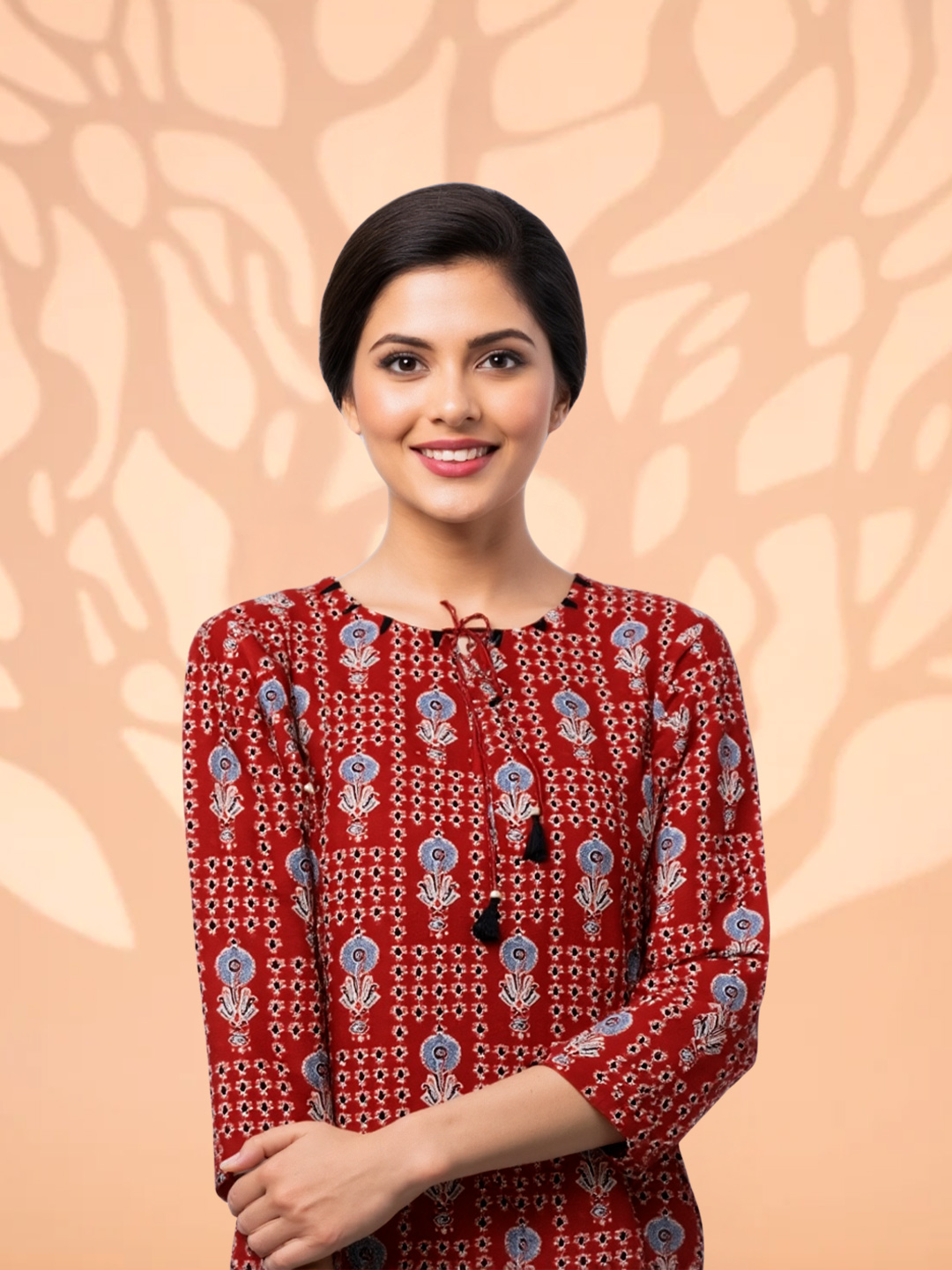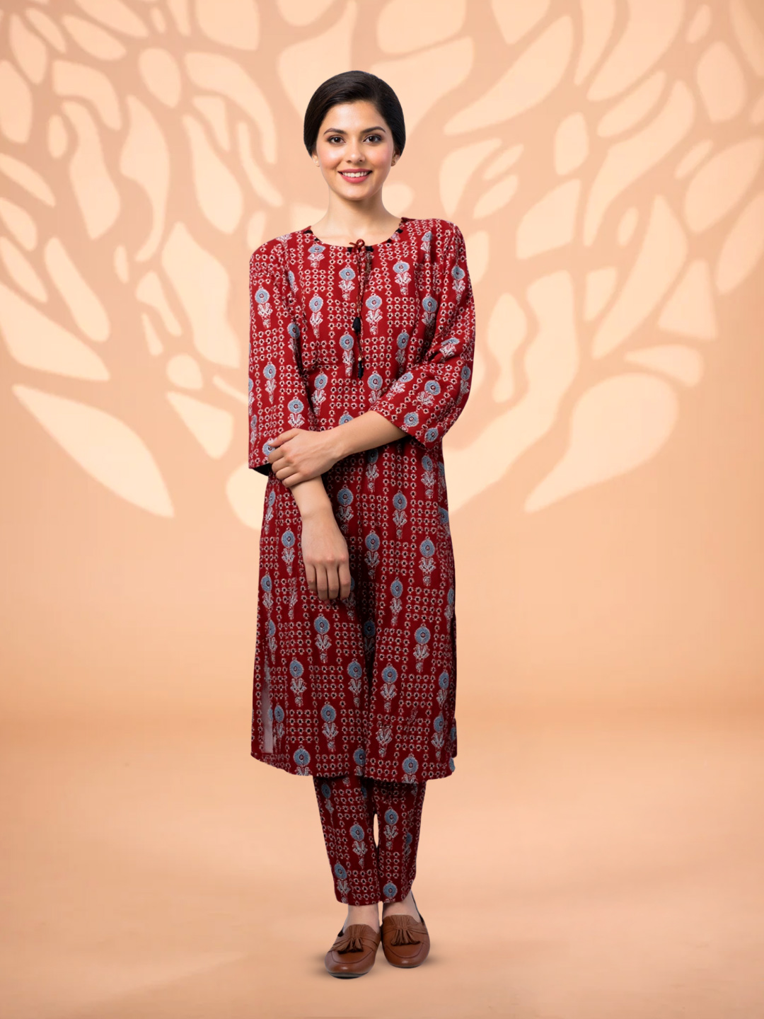 Featuring elegant ethnic prints, the kurta showcases a classic round neckline with tie-up tassels, adding a delightful touch of traditional charm. The style is perfect for both casual outings and festive gatherings.