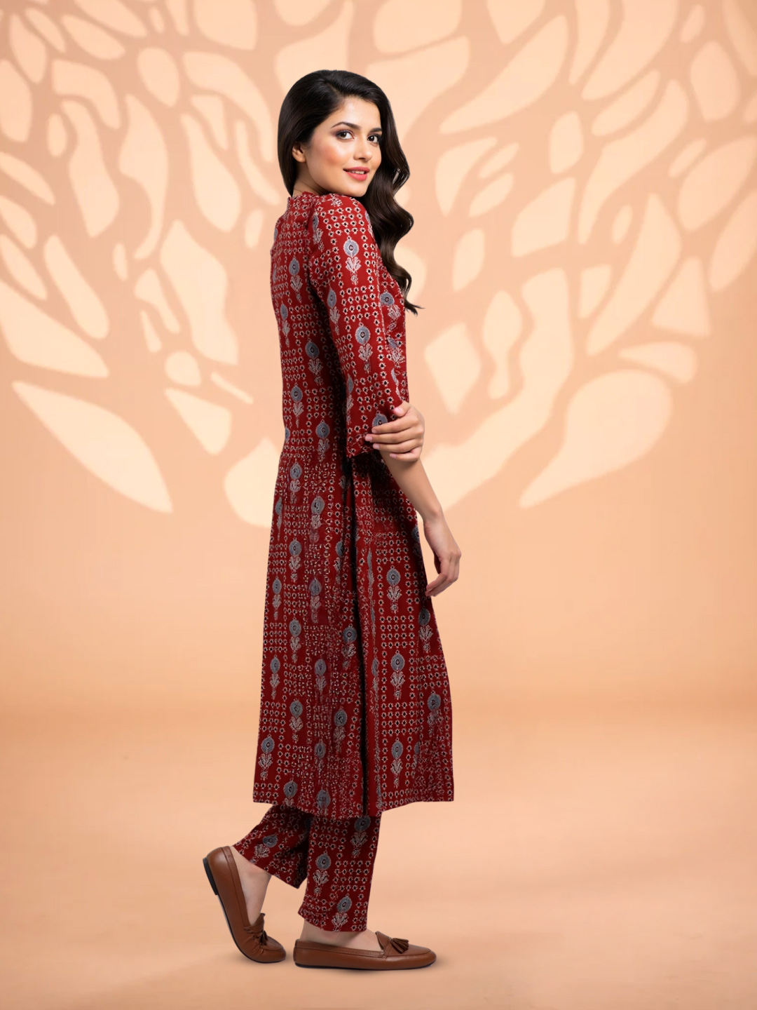 The set includes coordinated printed tapered pants, tailored for a clean, streamlined silhouette. These pants ensure a flattering fit while keeping the outfit effortlessly chic.