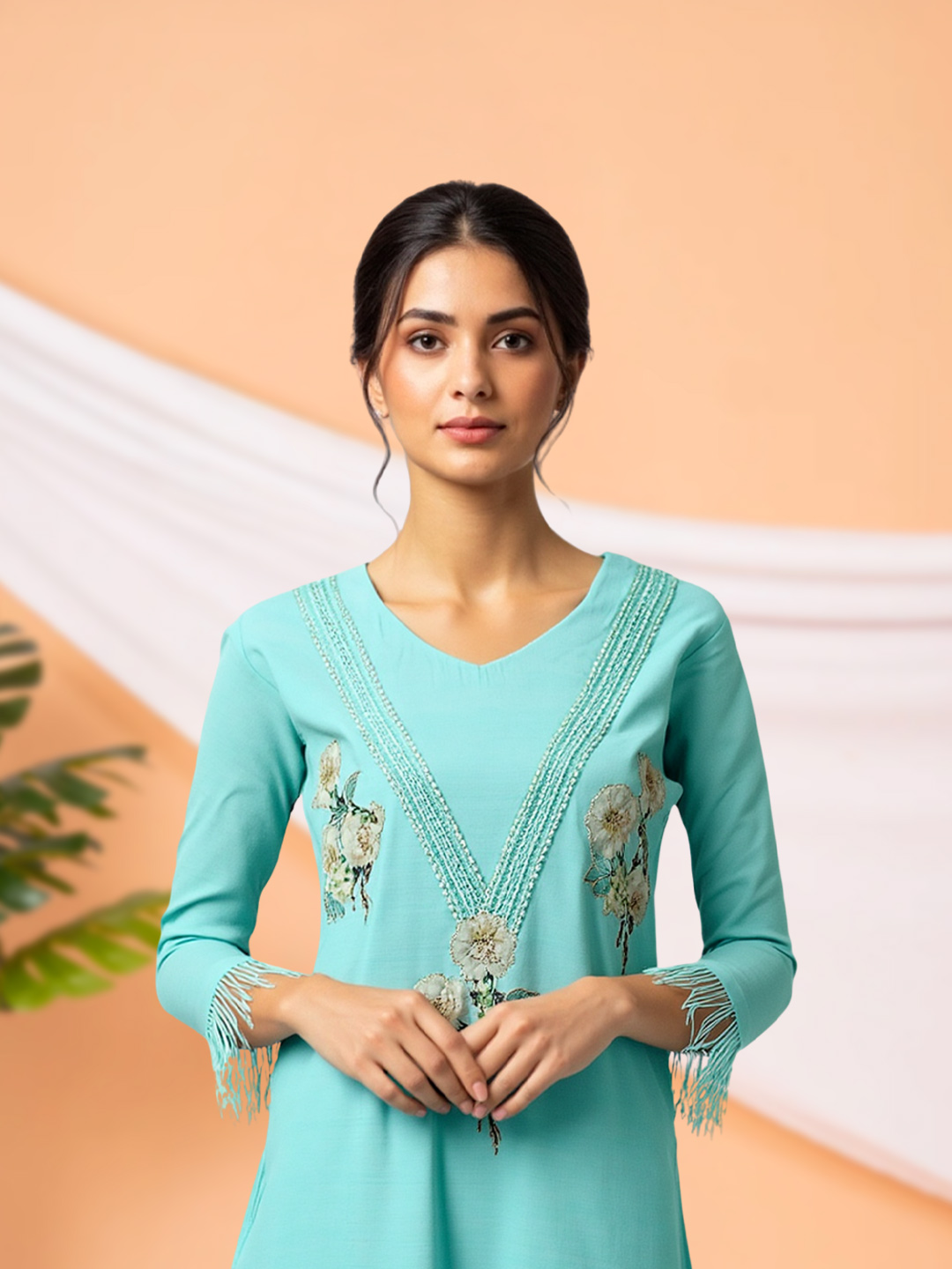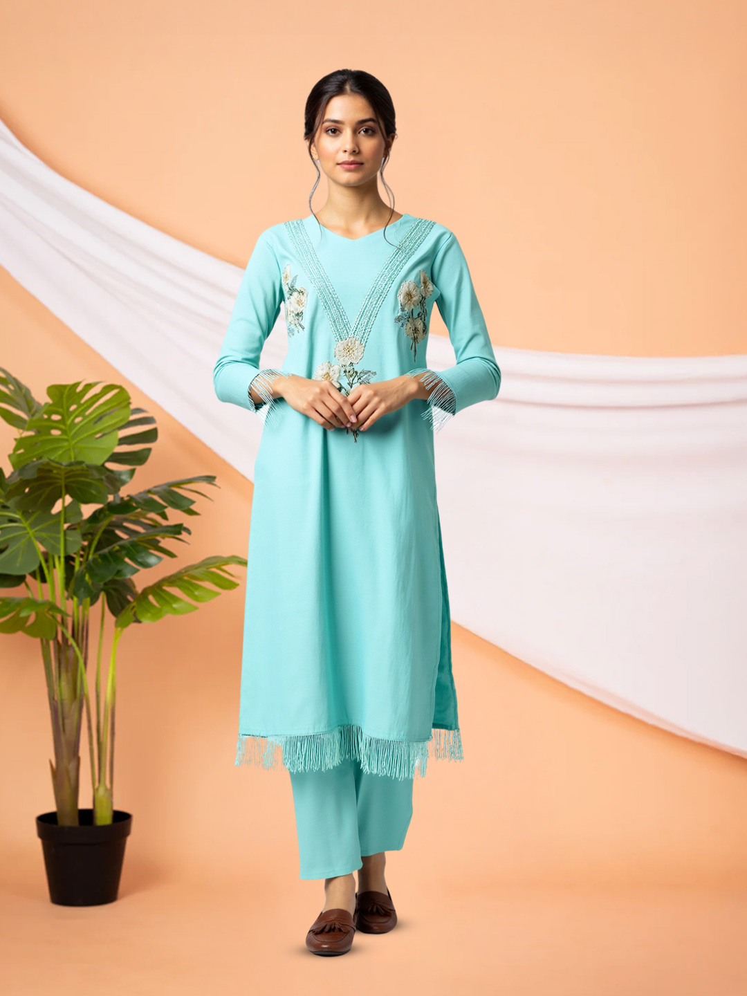 Stay effortlessly stylish with this V-neck embroidered set designed to turn heads. The delicate floral patterns exude ethnic grace, and the coordinated straight pants keep your look sleek and balanced. Ideal for festive events, get-togethers, or special outings.