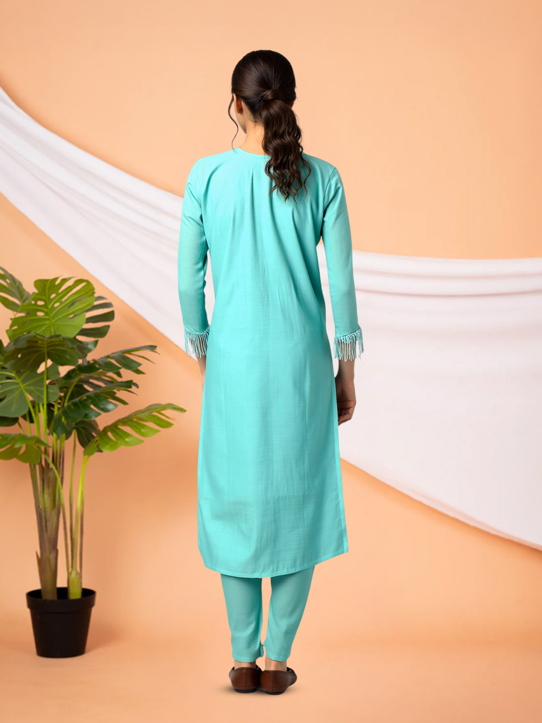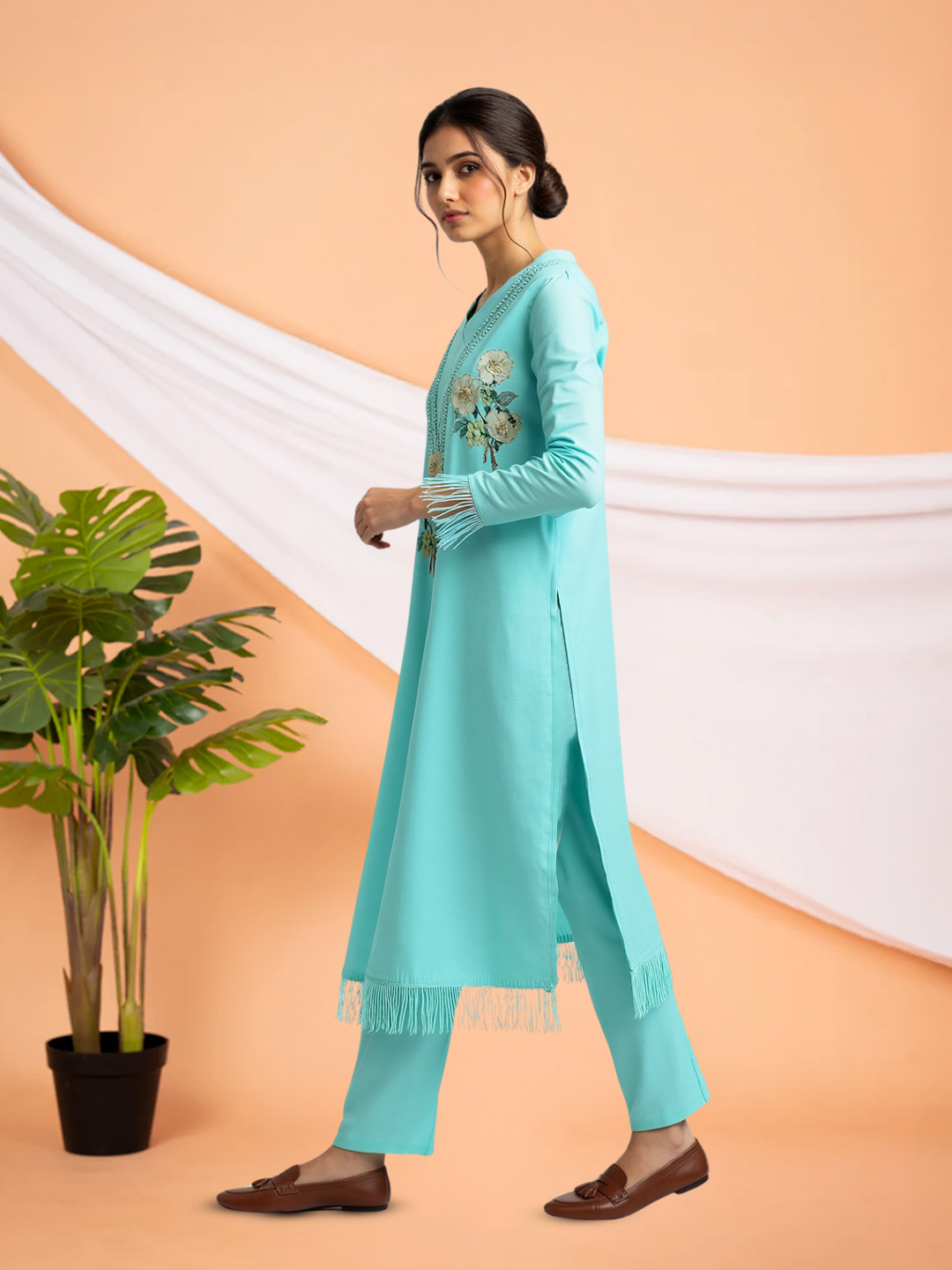 This embroidered salwar suit set blends elegance with comfort. The graceful V-neck design features subtle embellishments that enhance its beauty, while the matching straight pants offer a flattering, tailored fit—perfect for celebrations or daily elegance.