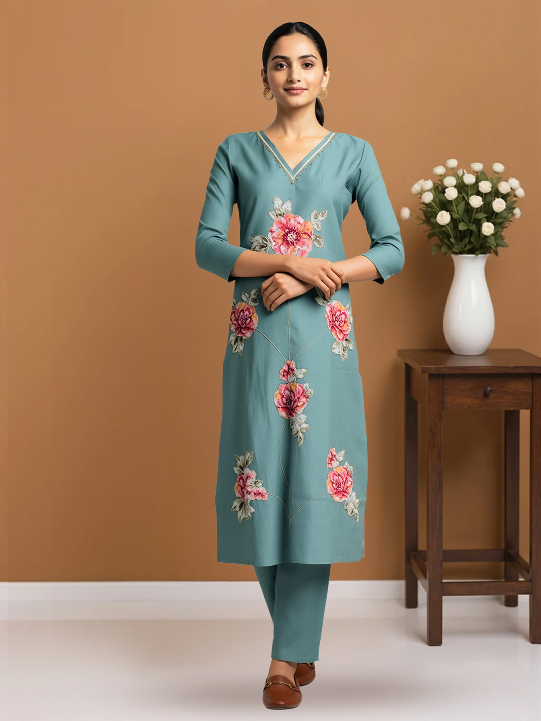 This salwar suit set showcases a graceful V-neck kurta adorned with floral embroidery for a refined and feminine look. Made from premium-quality fabric, it offers unmatched comfort. The floral dupatta ties the entire outfit together, creating an elegant and timeless ethnic ensemble.