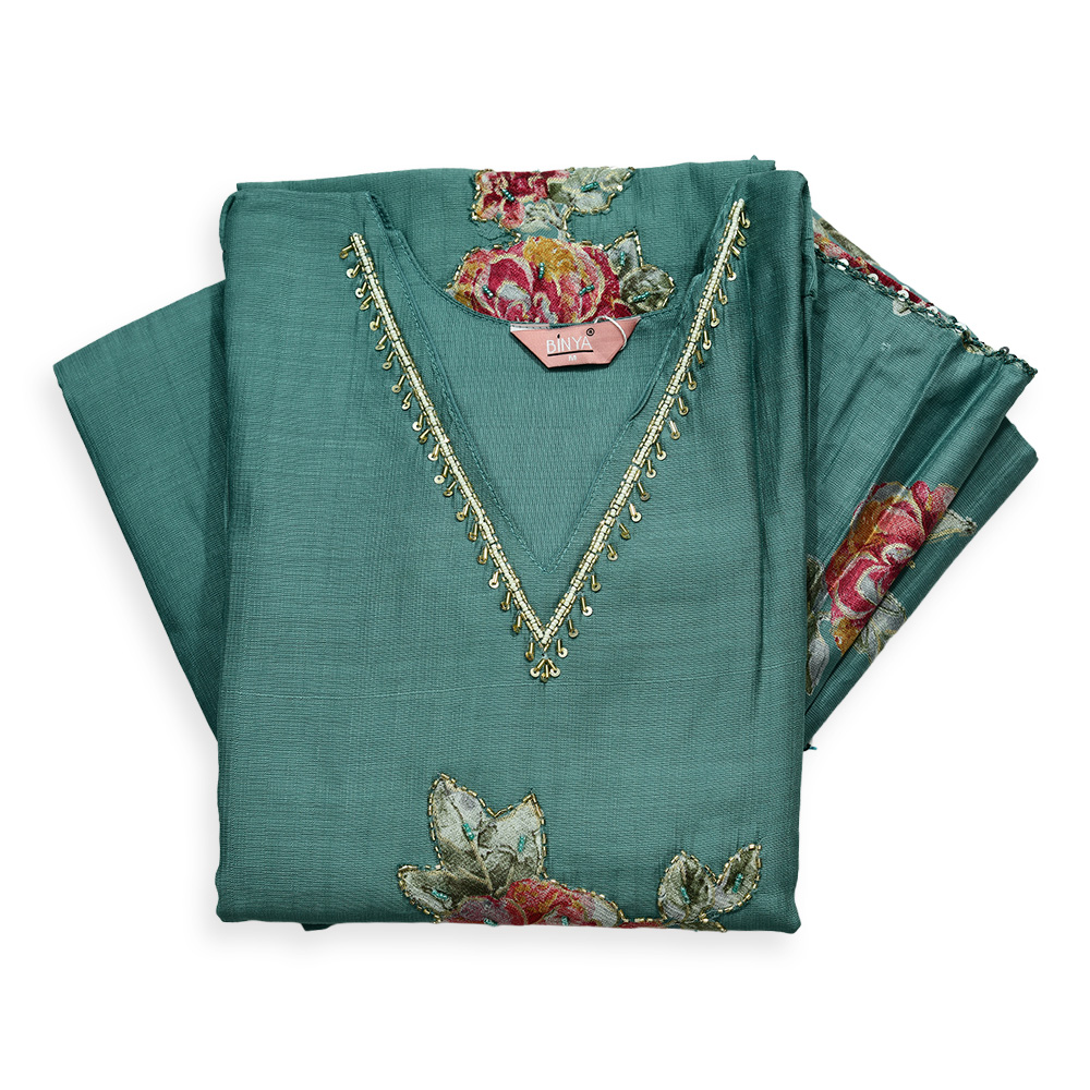 Designed for women who appreciate beauty and comfort, this suit set includes a beautifully embroidered V-neck kurta that instantly grabs attention. The premium-quality fabric ensures a soft, smooth drape, while the elegant floral dupatta completes the look with effortless sophistication.