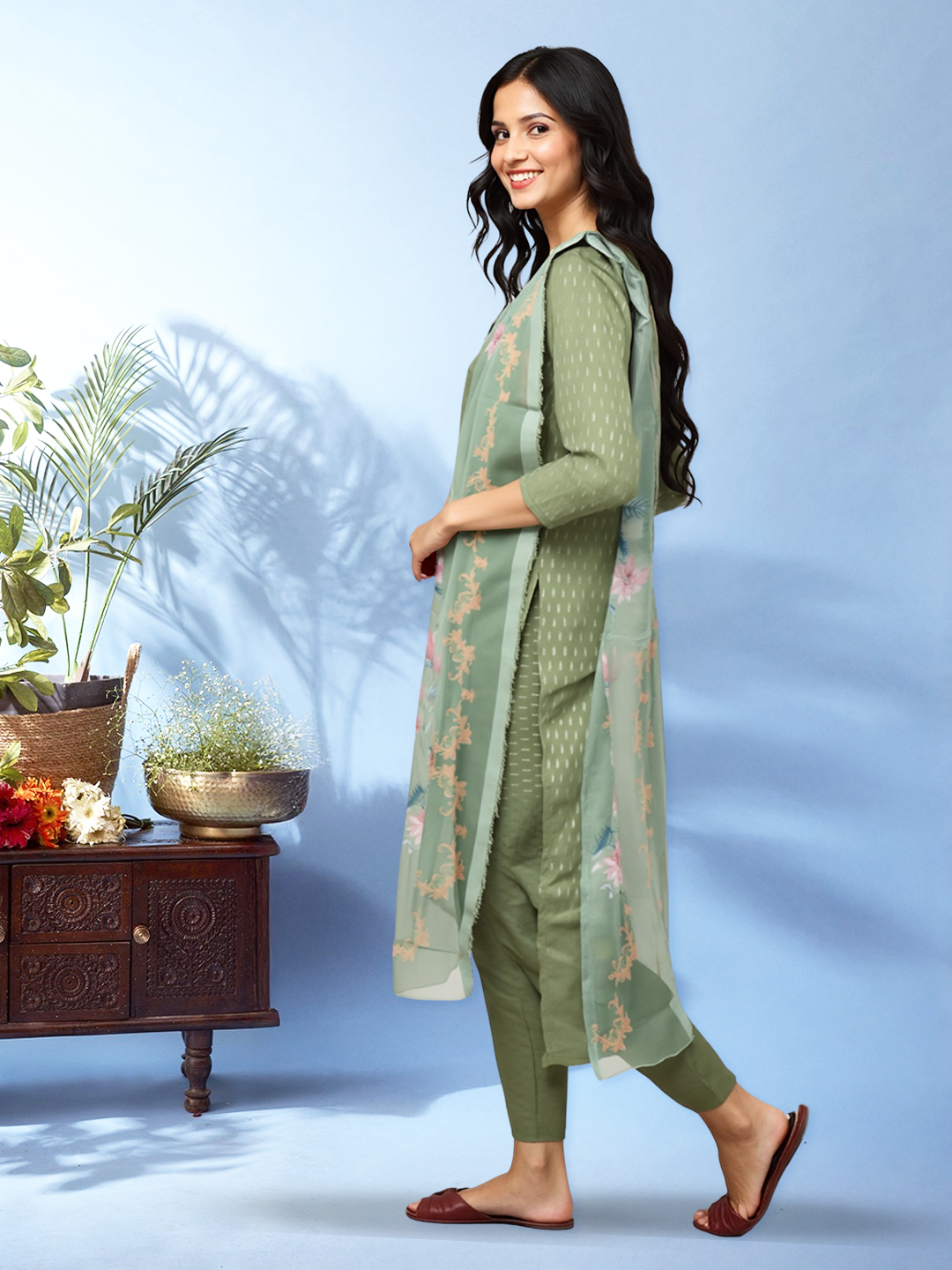 From brunches to festive evenings, this three-piece set is your ready-made style solution. Add jhumkas and a pair of juttis, and you’re all set to glow with grace.