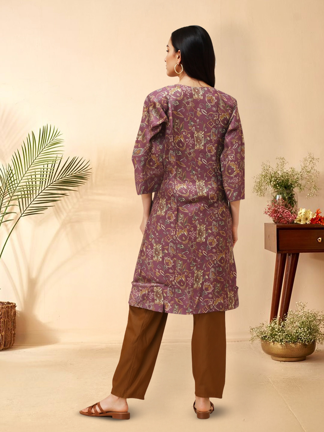 Tailored straight-cut pants give the outfit a contemporary silhouette, complementing the printed kurta while keeping things clean and refined.